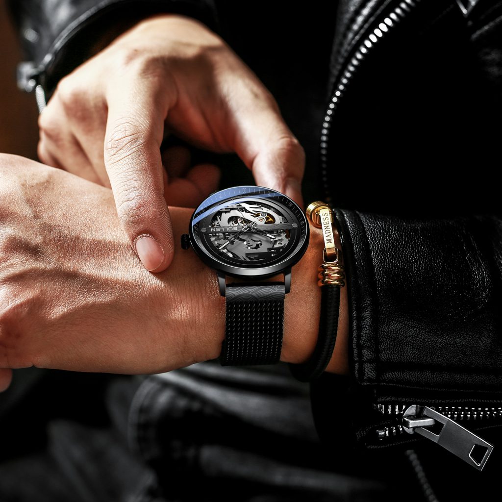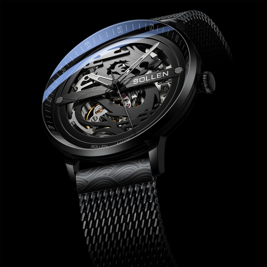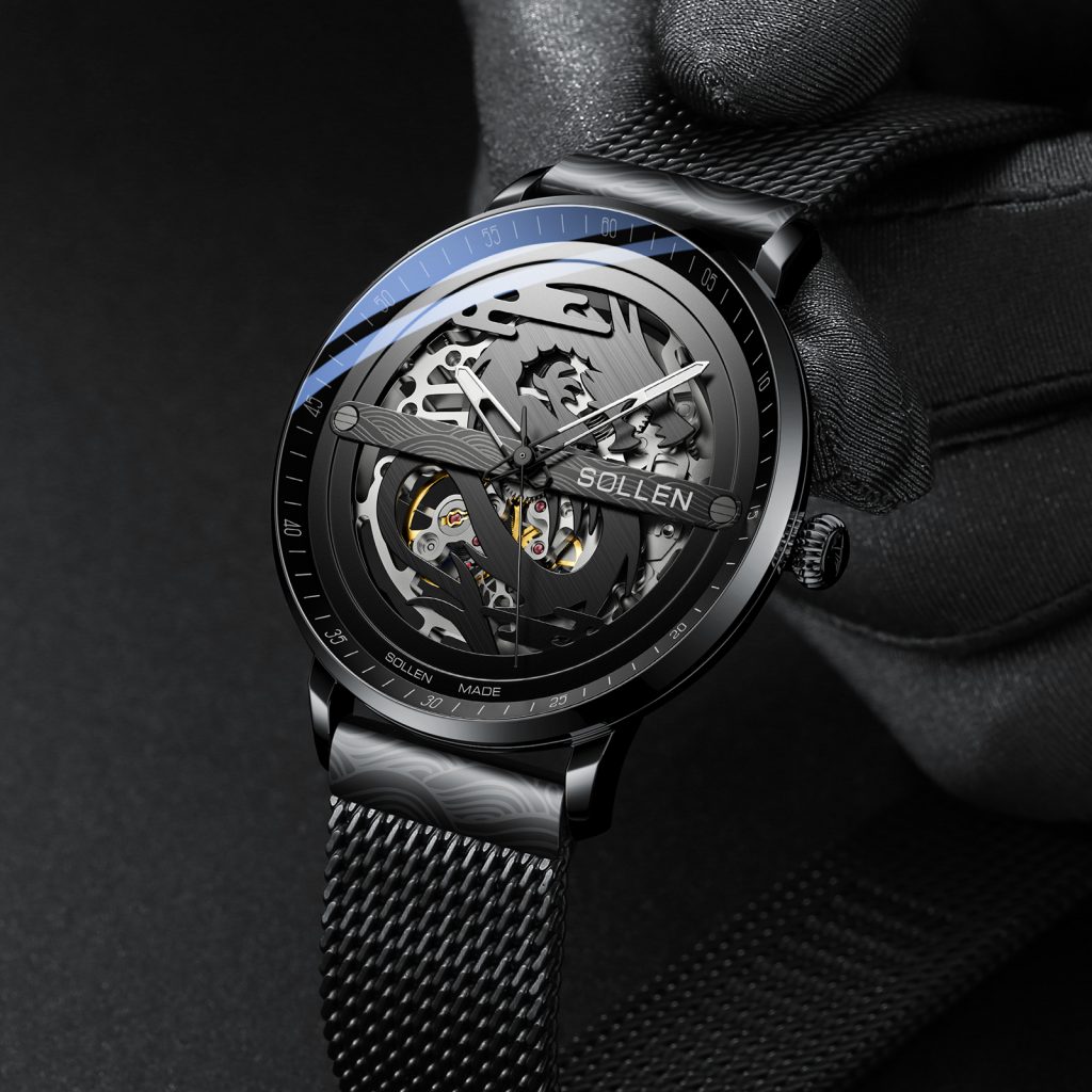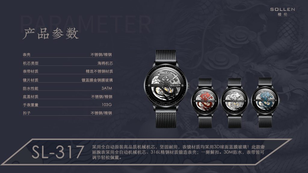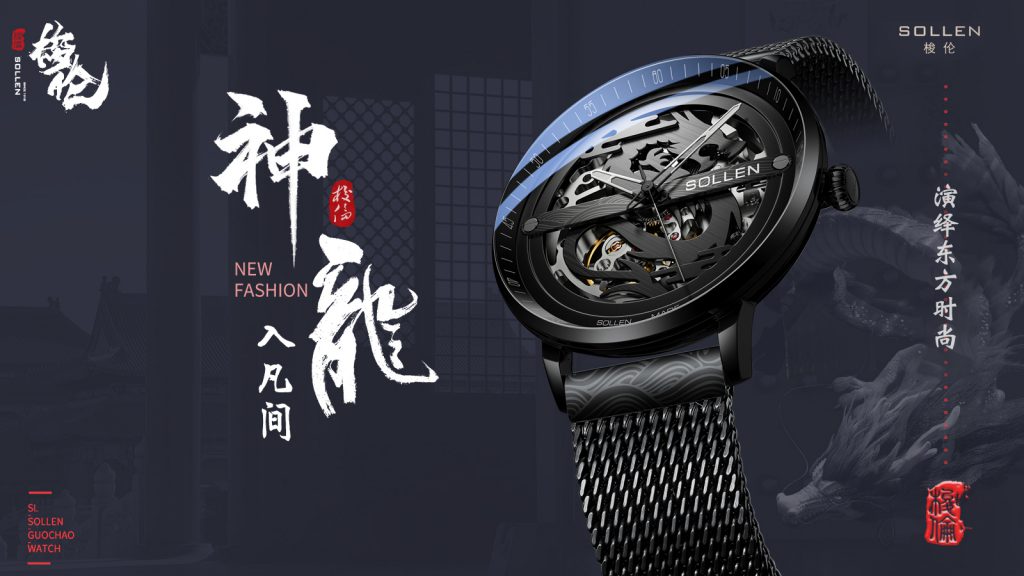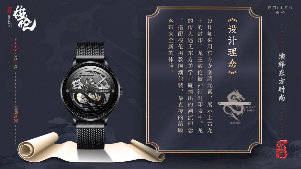 设计师采用东方龙图腾元素,展示上古龙王的封印,龙王敖伦被神钉封印表中。龙的传人遇见东方美学,碰撞出的潮流理念。搭配梭伦男款国潮包装,最直接的给顾客带来全新的体验。