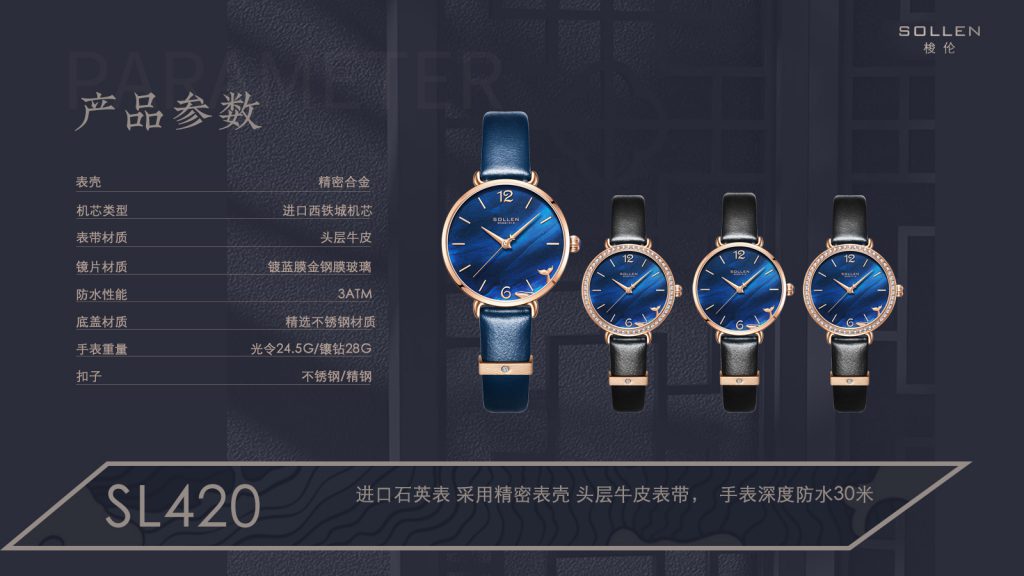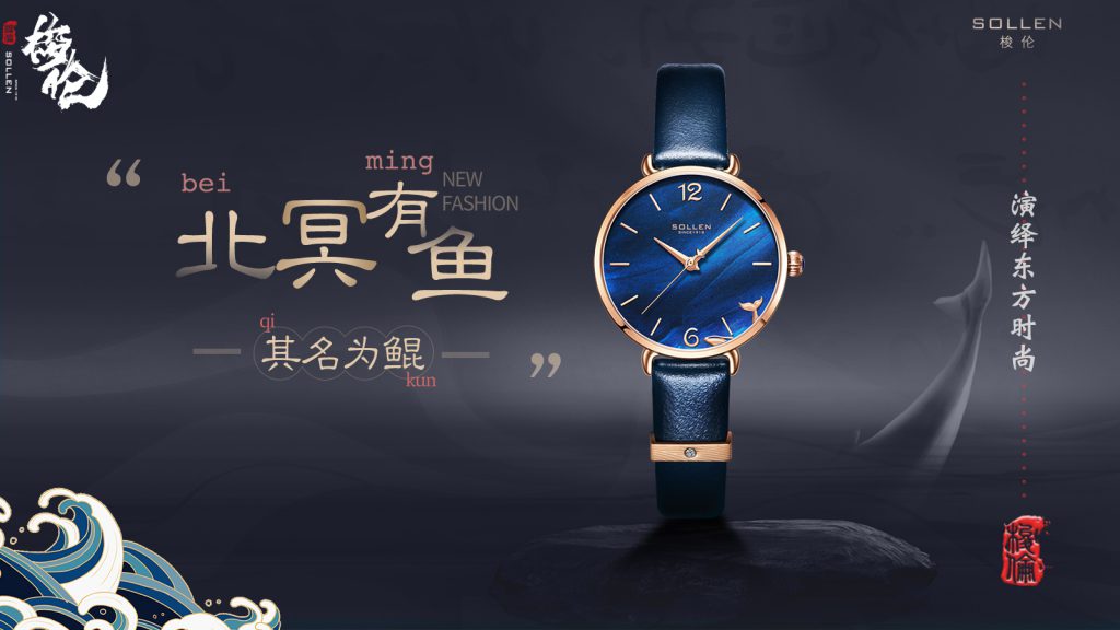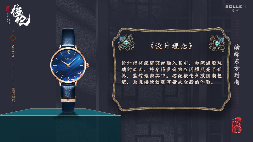 设计师将深海蓝鲸融入其中,如深海般琉璃的表面,施华洛世奇锆石闪耀照亮了世界,蓝鲸遨游其中。搭配梭伦女款国潮包装,最直接地给顾客带来全新的体验。