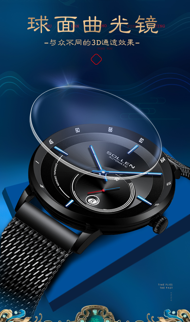 【款式卖点】: 球面曲光镜,与众不同的3D通透效果, 原装机芯,强核机芯 ,稳定精准,精选不锈钢表壳,表壳更加耐磨耐摔