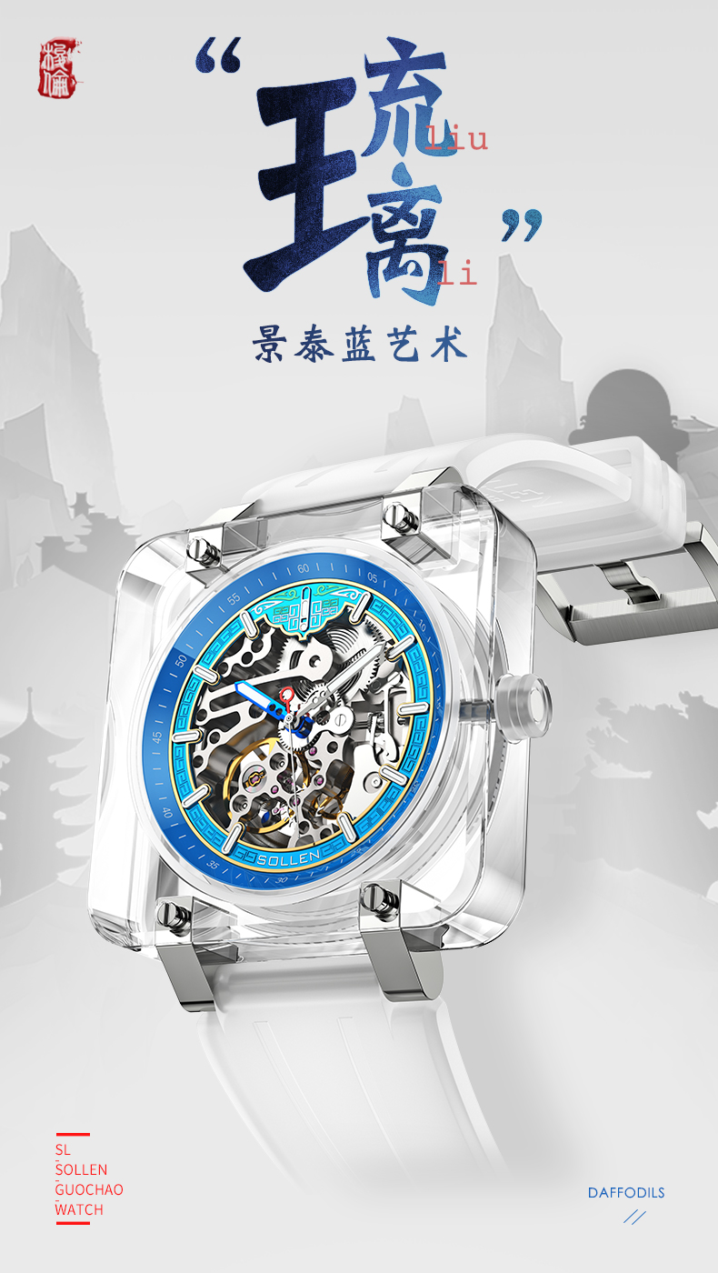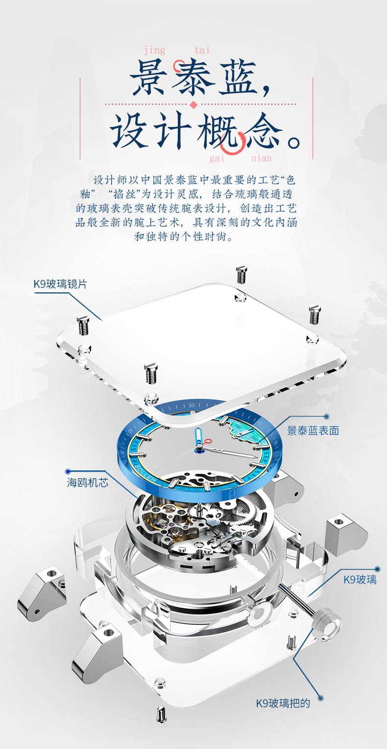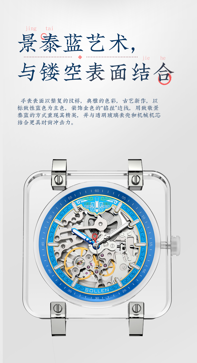 2.手表元素采用天圆地方,表面以繁复的纹样,典雅的色彩,古艺新作,以标致性蓝色为主色,装饰金色的“掐丝”边线,用致敬景泰蓝的方式重现其精美,并与透明琉璃表壳和机械机芯结合更具时尚冲击力。