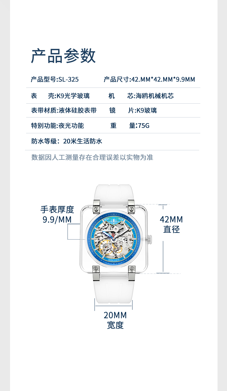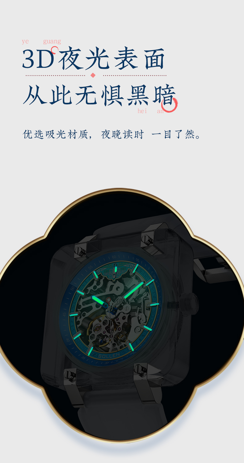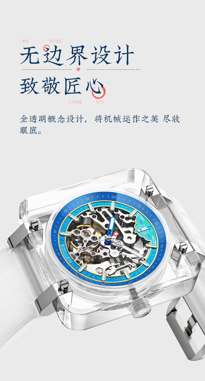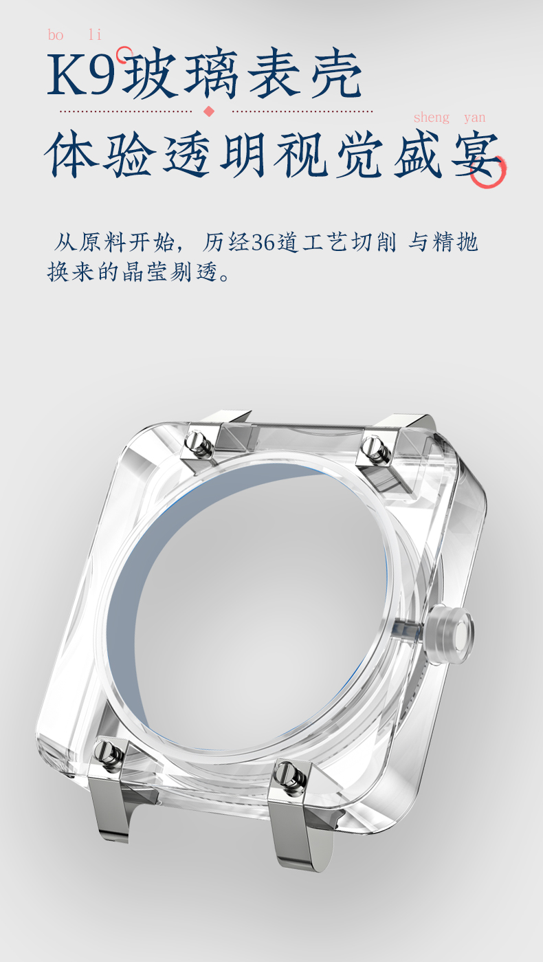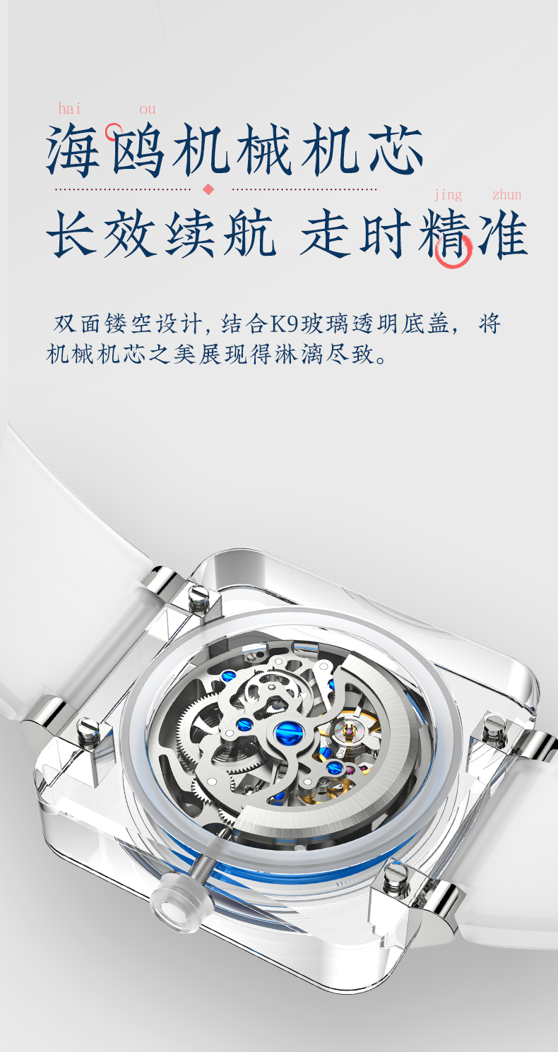 3.K9琉璃表壳,镂空刻度设计,海鸥机械机芯,K9玻璃表镜。琉璃表壳及双面镂空设计将机芯之美展现的淋漓尽致,硅胶表带,佩戴贴合手腕更舒适。