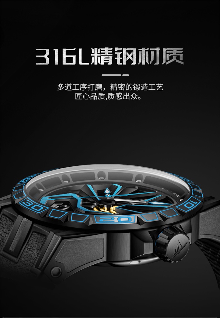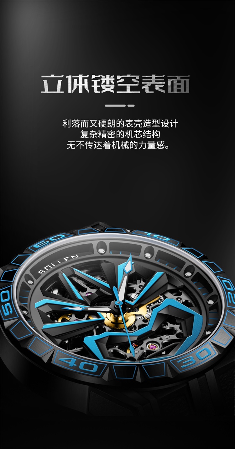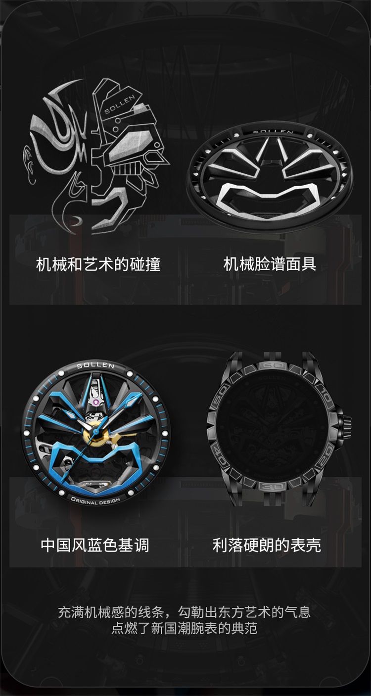 【款式卖点】:表面已黑和蓝色为主要,充满机械感的线条,勾勒出东方艺术的气息,从脸谱细看机芯,可以看到复杂又规整精密的机芯构造,无不传达这机械的力量感,点燃新国潮的潮流腕表典范