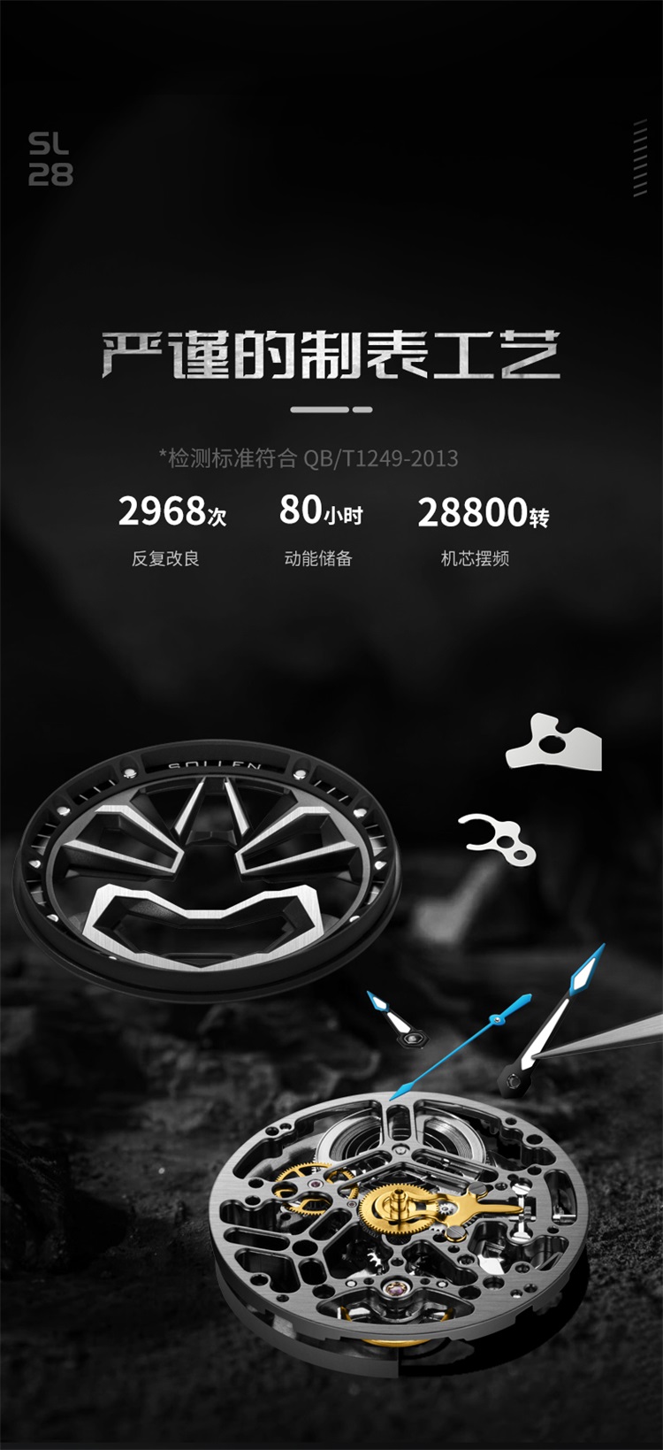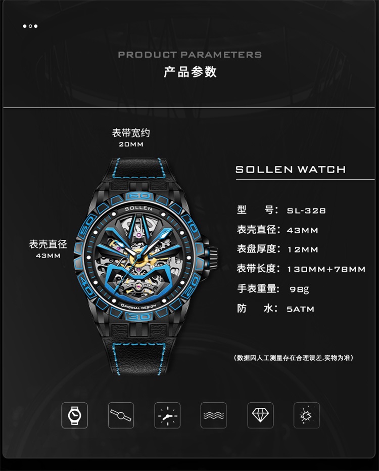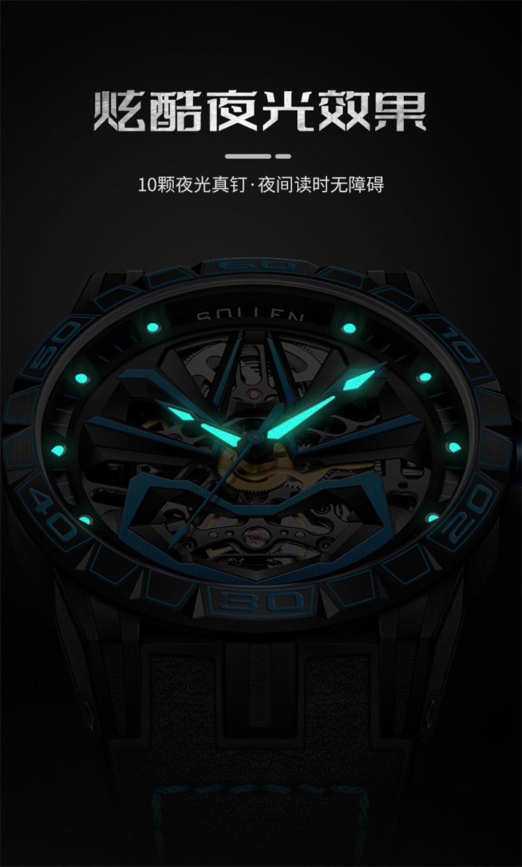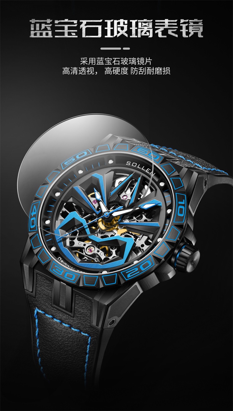 【款式卖点】:表面已黑和蓝色为主要,充满机械感的线条,勾勒出东方艺术的气息,从脸谱细看机芯,可以看到复杂又规整精密的机芯构造,无不传达这机械的力量感,点燃新国潮的潮流腕表典范
