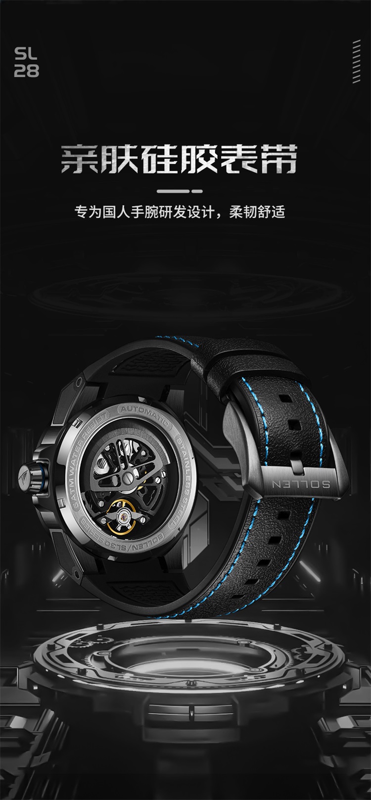 【材质工艺】:蓝宝石玻璃镜面,高清透视,高硬度,搭配316L精钢表壳,精密严谨的锻造工艺,匠心制作,亲肤硅胶表带,柔软舒适