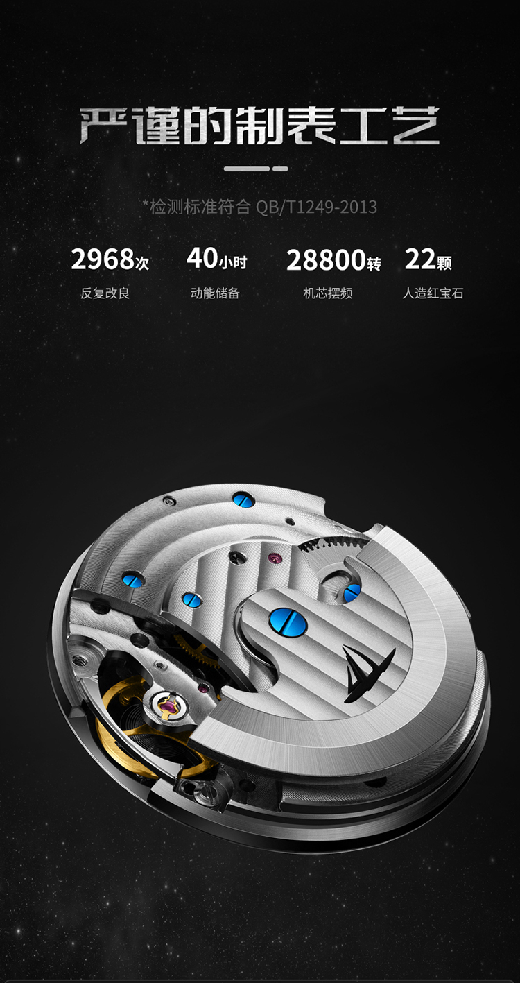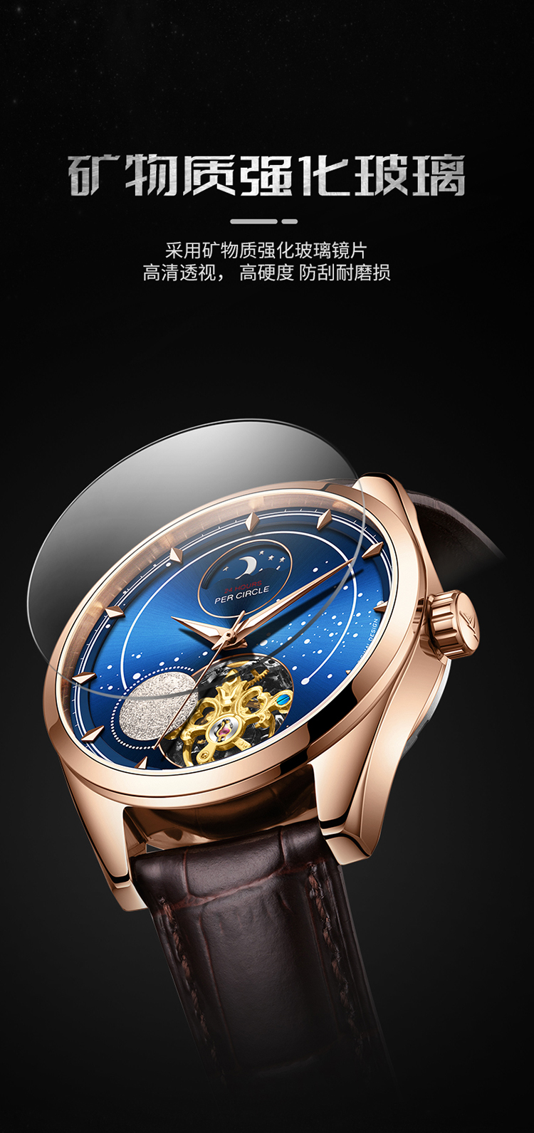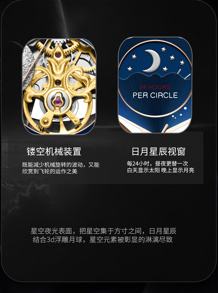 【款式卖点】:表盘以蔚蓝星空作为载体,把宇宙尽在腕上方寸之间,8点位置的3D油压浮雕银色月球与6点位置的镂空机械装置相应和,让月球地貌栩栩如生,星河璀璨。12点位置是日月星辰橱窗,每24小时,昼夜更替一次,白天显示太阳晚上显示月亮。