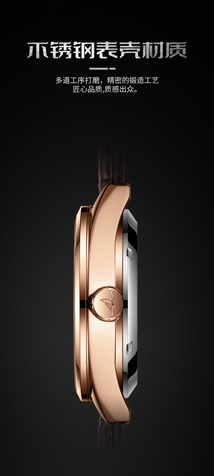 【材质工艺】:矿物质强化玻璃,高硬度高清透视。不锈钢表壳材质,精密的锻造工艺,匠心品质,质感出众。牛皮表带,舒适贴合手腕弧度,柔韧轻盈。