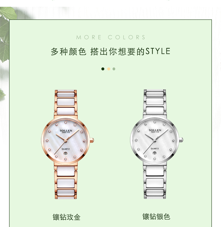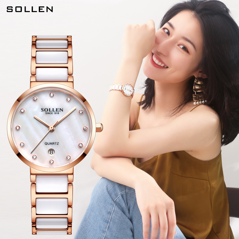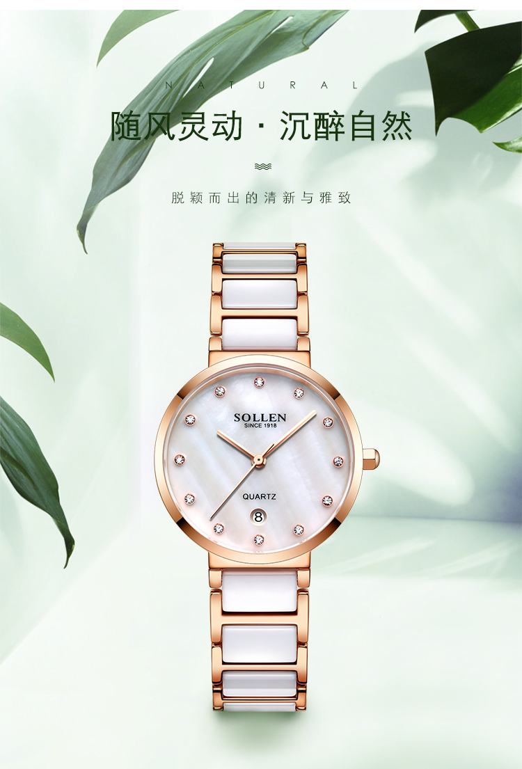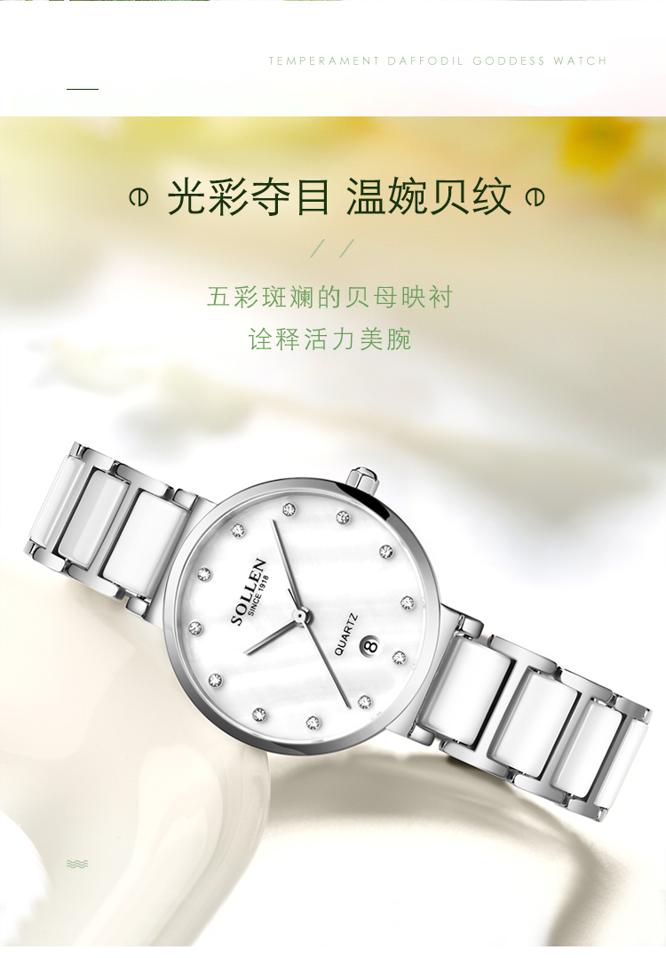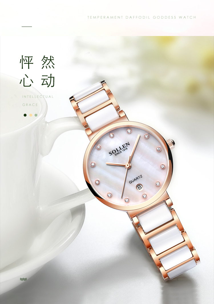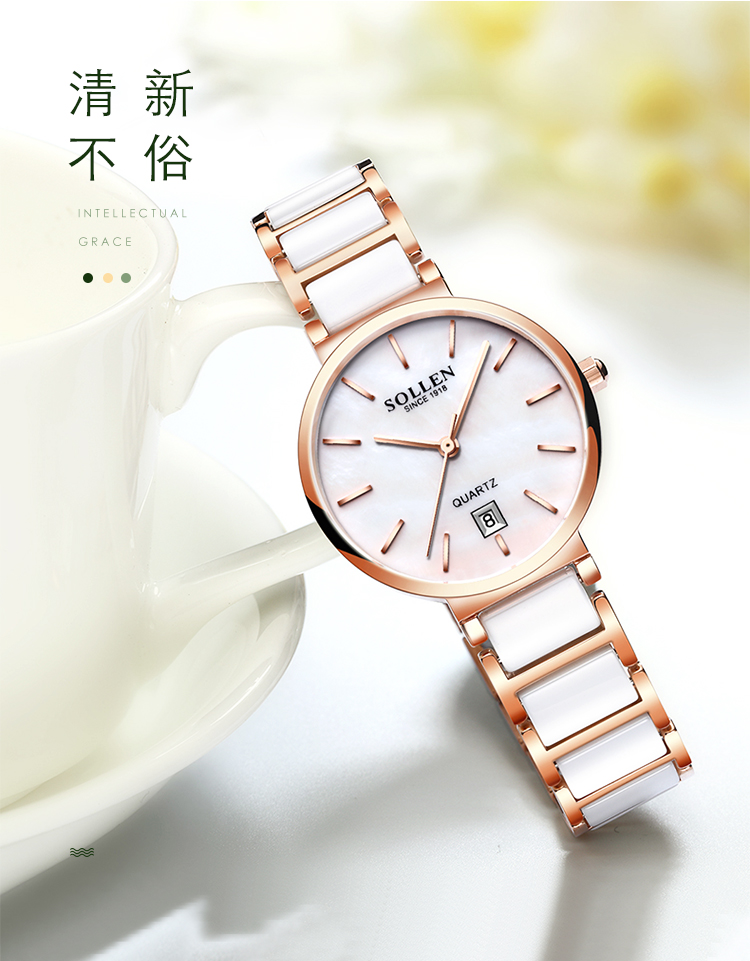 【款式卖点】:梭伦陶瓷系列女表,优雅的设计和陶瓷工艺的巧妙融合,为这一腕表注入新内涵。