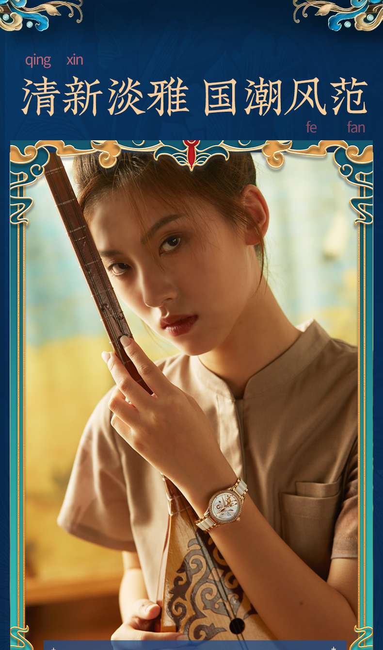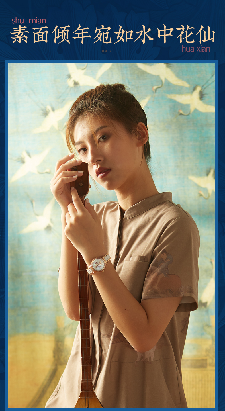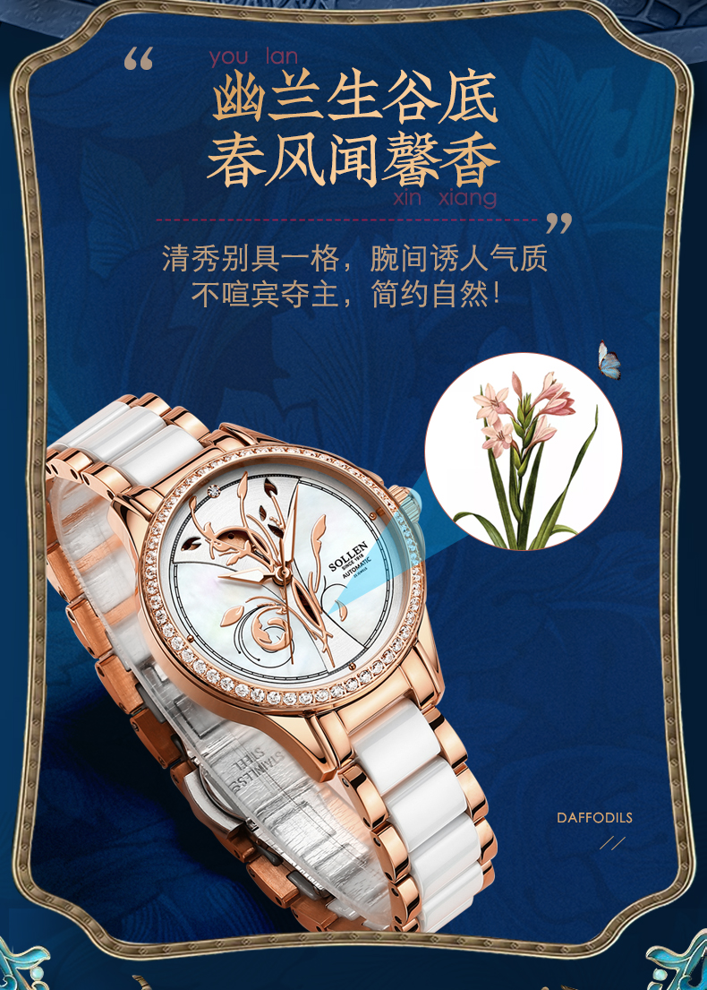 【款式卖点】:手表中融入中国传统名花中的兰花作为立体浮雕的图案,彰显手表独特的灵空的唯美,手表外铺满施华锆石加上12点钟施华锆石点缀,衬托清秀别具一格,腕间诱人气质,不喧宾夺主,简约自然,搭配精选不锈钢间陶瓷表带,让手表浑然天成,佩戴更舒适