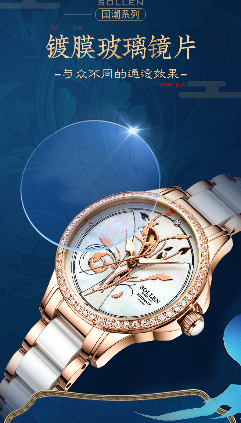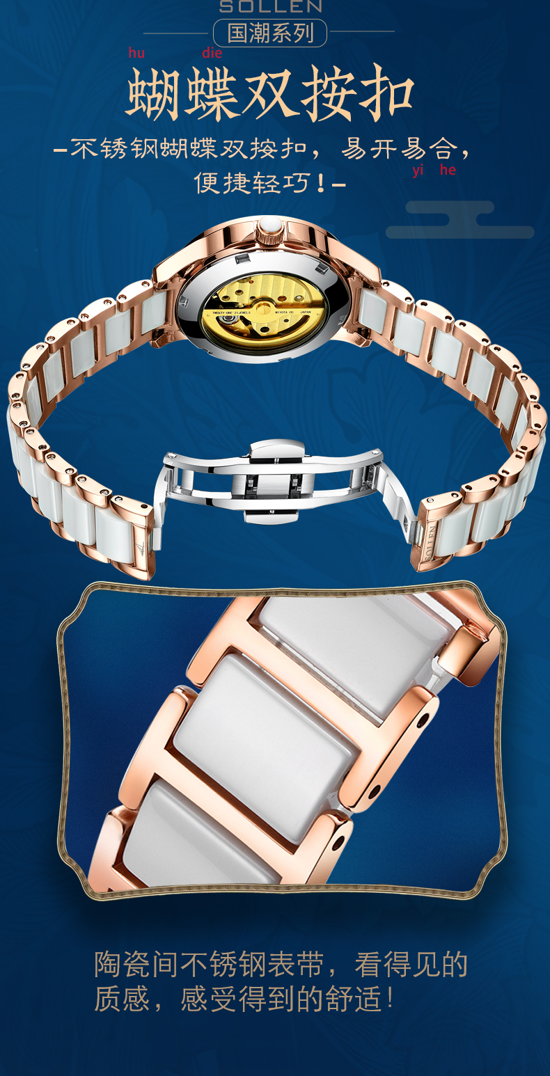 【材质工艺】:表带材质由精选不锈钢间陶瓷制造而成,陶瓷腕带,体验亲肤质感。蝴蝶表带秒待秒解 ,采用原装全自动机械机芯、表镜由镀膜玻璃制造