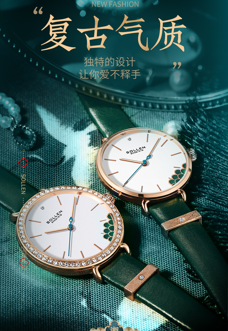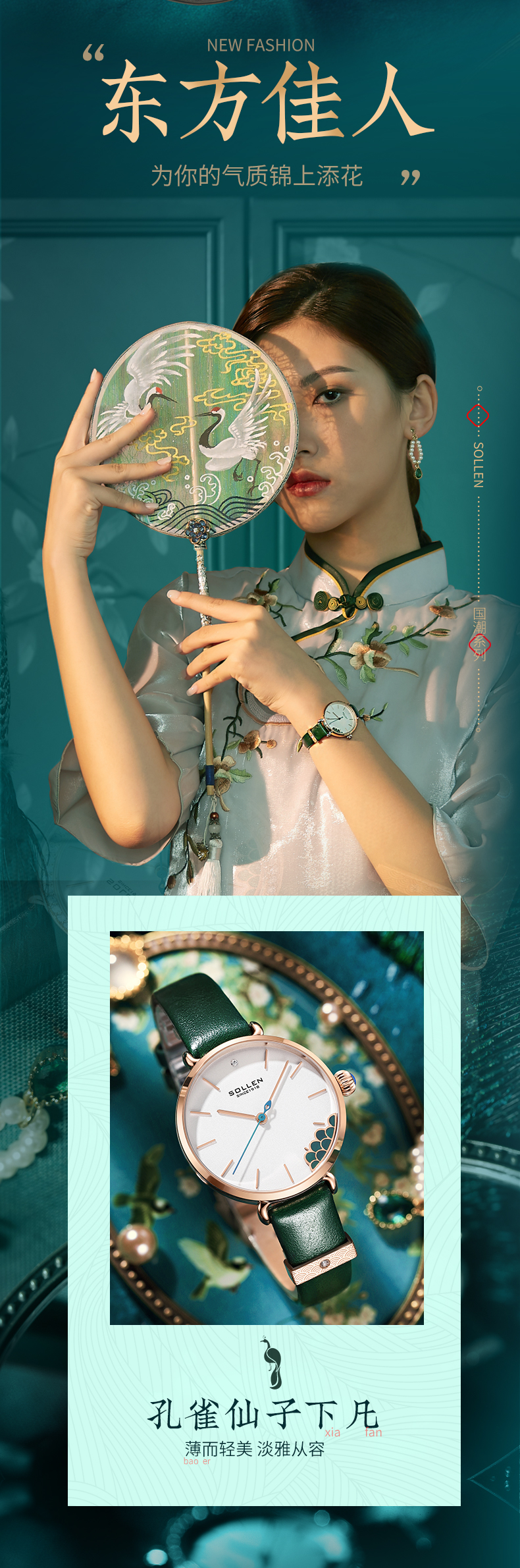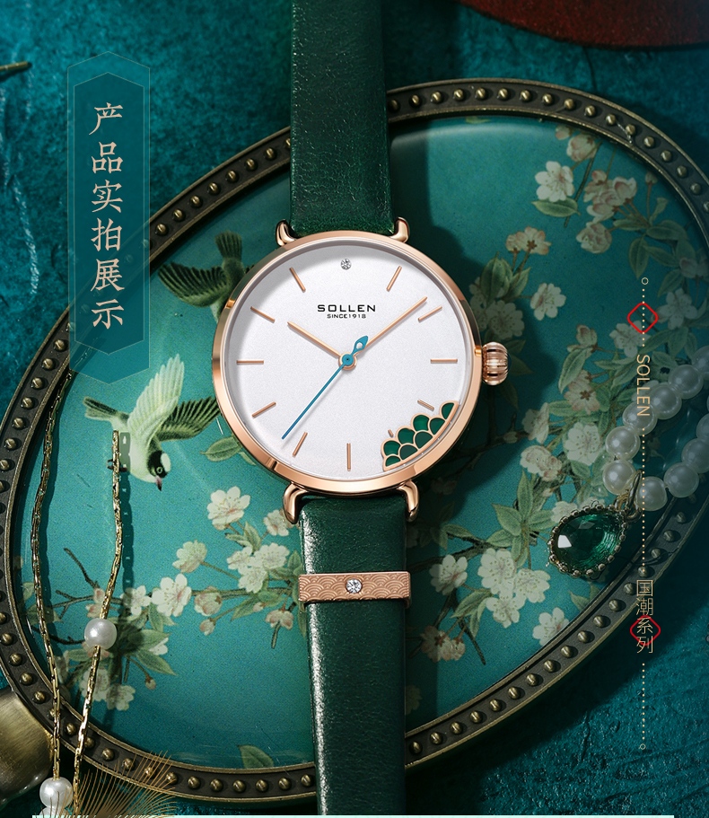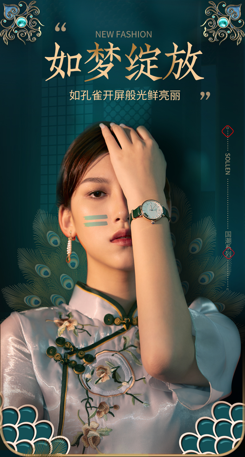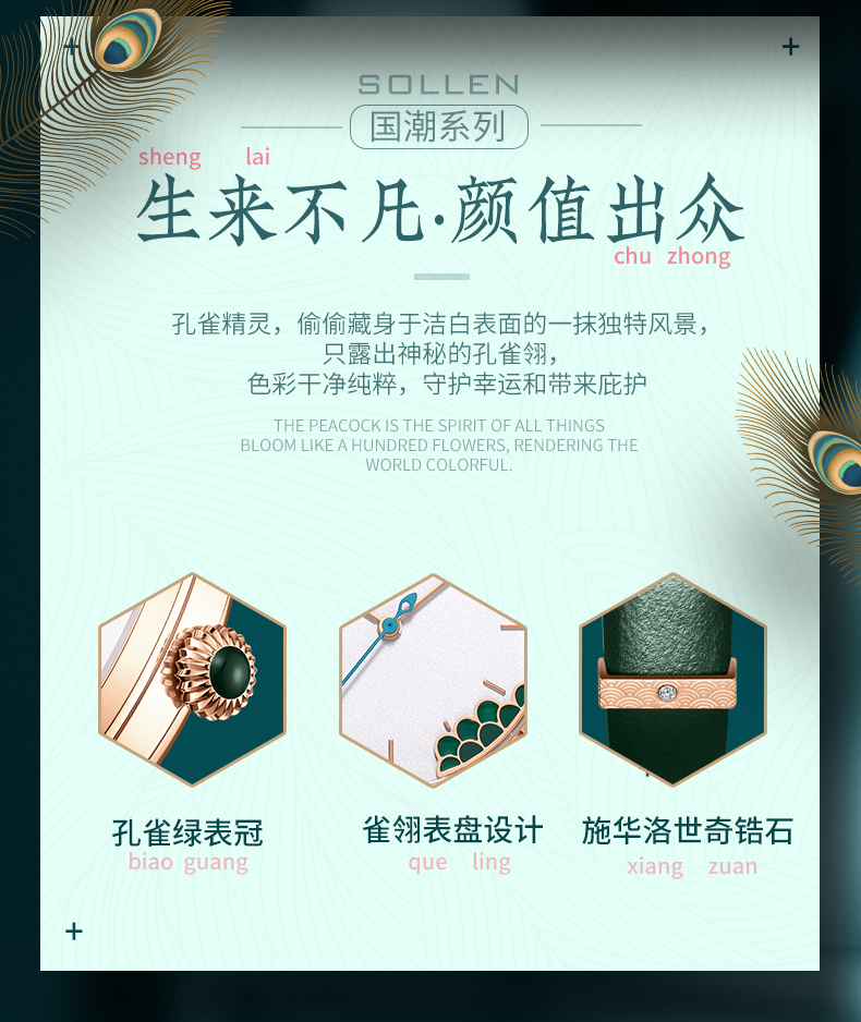 【设计创意】:设计师将孔雀元素融入其中,寓意着如孔雀开屏般光鲜亮丽,搭配着孔雀翎秒钟,分分秒秒都是幸福的象征。搭配梭伦女款国潮包装,最直接的给顾客带来全新的体验。