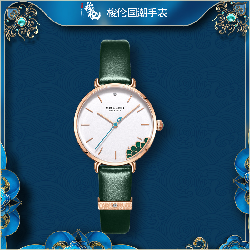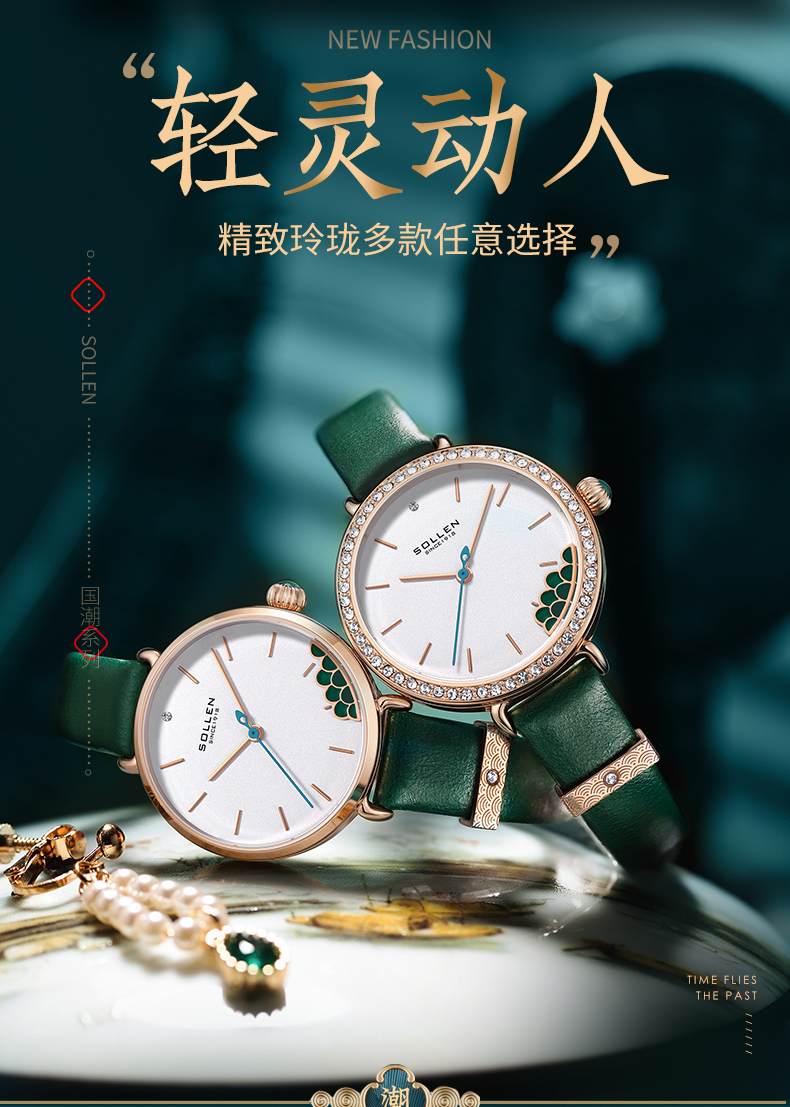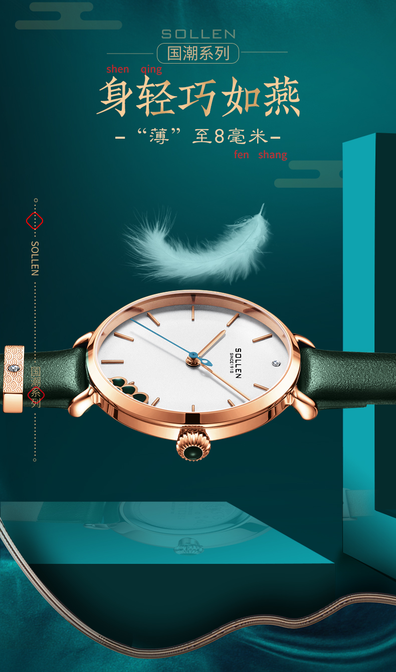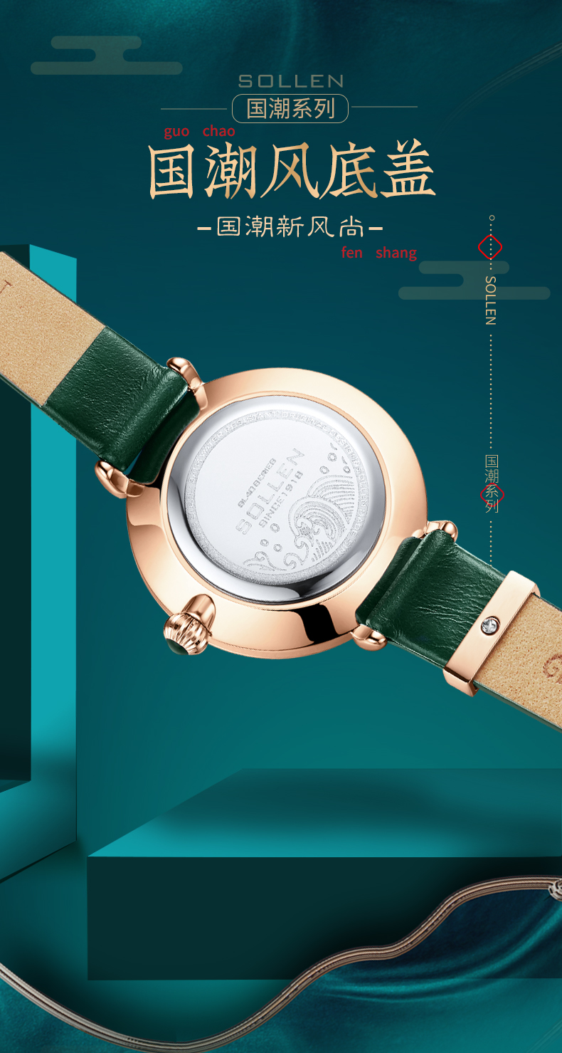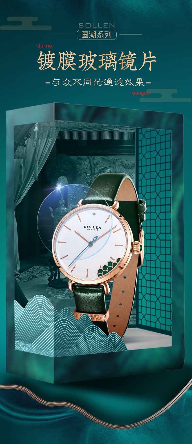 【设计创意】:设计师将孔雀元素融入其中,寓意着如孔雀开屏般光鲜亮丽,搭配着孔雀翎秒钟,分分秒秒都是幸福的象征。搭配梭伦女款国潮包装,最直接的给顾客带来全新的体验。