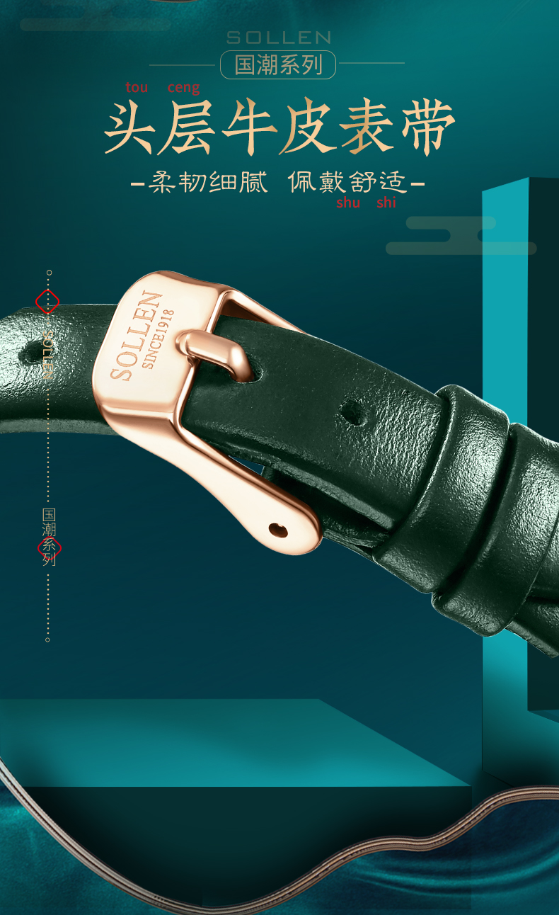 【材质工艺】:色泽精美但又显复古的孔雀绿,非常的显白,佩戴上去就是皮肤显白干净。8mm超薄表盘别具一格“薄”出新风尚,简约大方,百搭饰品,提高气质的小单品皮带上镶施华洛世奇合成锆石尽显奢华。
