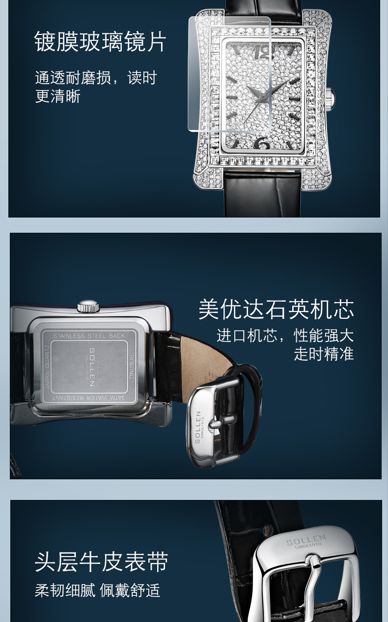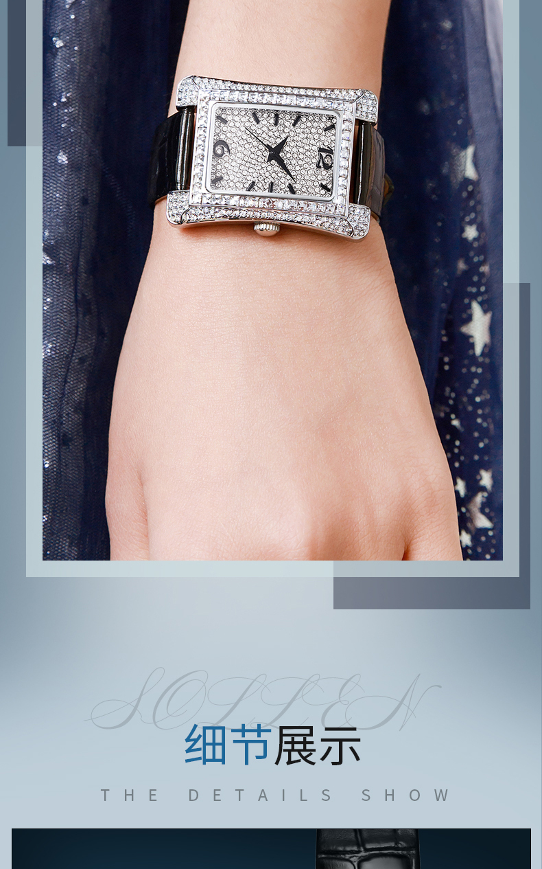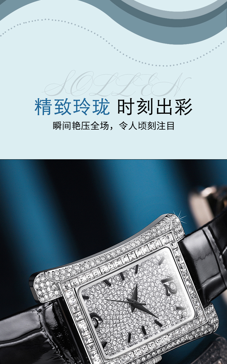 1、梭伦经典小蛮腰设计女表采用曲线表壳设计,优美的弧度构成舒适的佩戴感,采用精美元素,奢华合成锆石璀璨带来经典奢华美感。