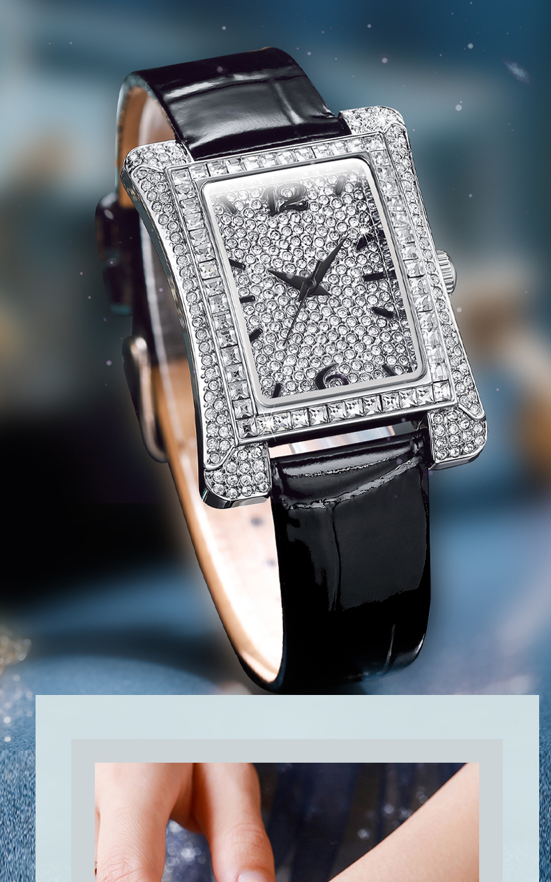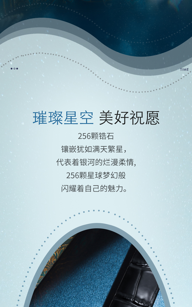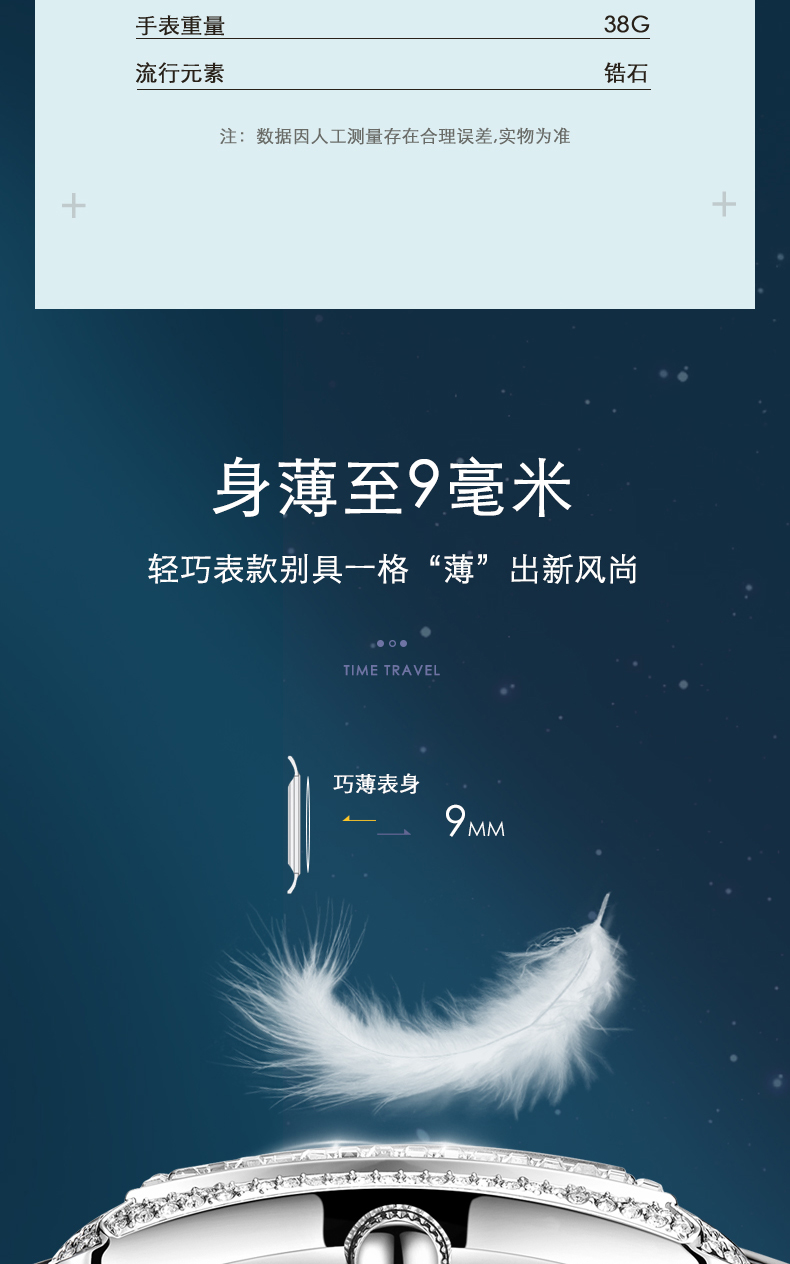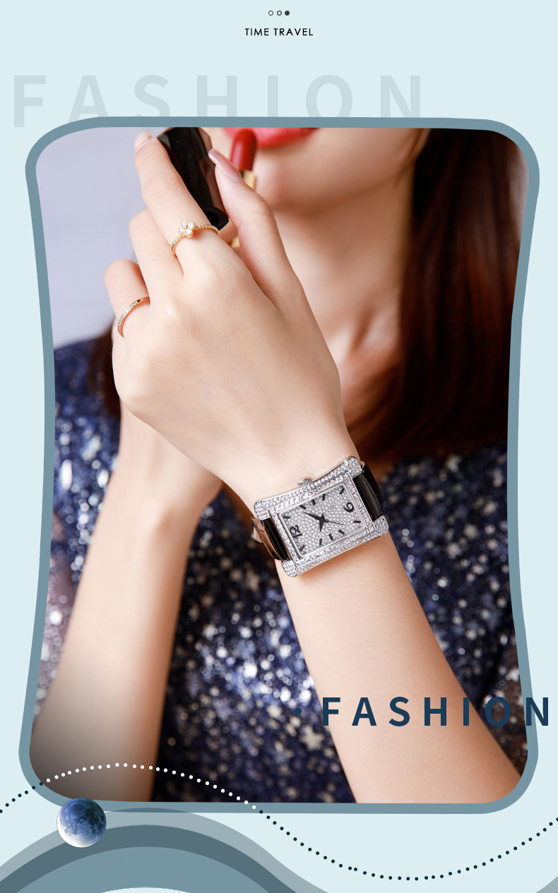 2、合成锆石规格:表壳镶捷克圆合成锆石:116颗,镶捷克方合成锆石:52颗,表面镶嵌合成锆石:214颗;整表总镶嵌合成锆石382颗,打造闪耀立体表盘。