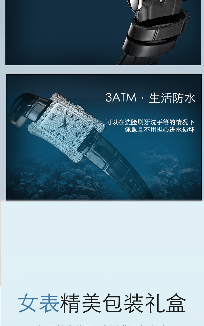 5、搭配亮眼的鳄鱼压花纹漆皮表带,材质采用牛皮表带,佩戴舒适,透气不易过敏