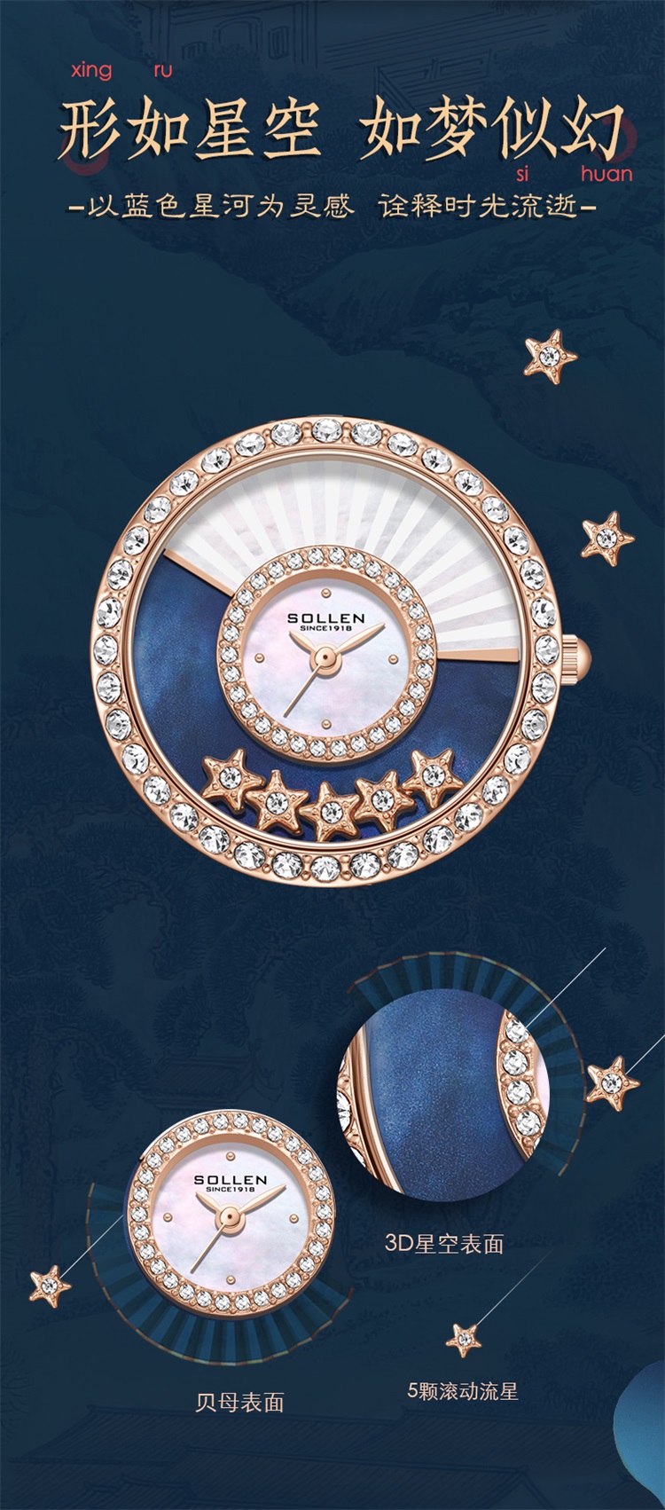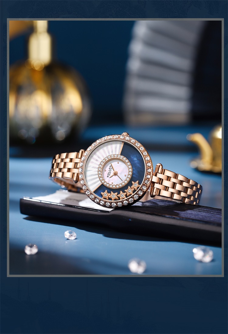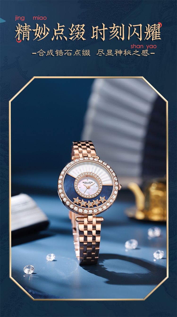 【款式卖点】 贝母表盘和3D星空表面搭配5颗星形滚珠,在阳光的渲染下流光幻彩,将漫天星辰渲染折扇,手腕轻摇,晨星流动,姿态悠然,生动有趣,不经意间,成为了旁人眼中夏日的风景。表壳外圈合成锆石满圈镶嵌,灵动流光般在手腕间闪耀。