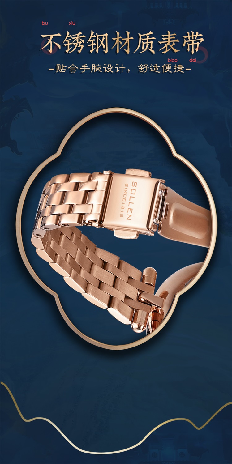 【材质工艺】进口石英机芯,性能稳定,走时精准,矿物质强化玻璃,通透耐磨,读时清晰,不锈钢材质表带,金属光泽,线条显质感,双按钢带折叠扣,方便佩戴解扣。