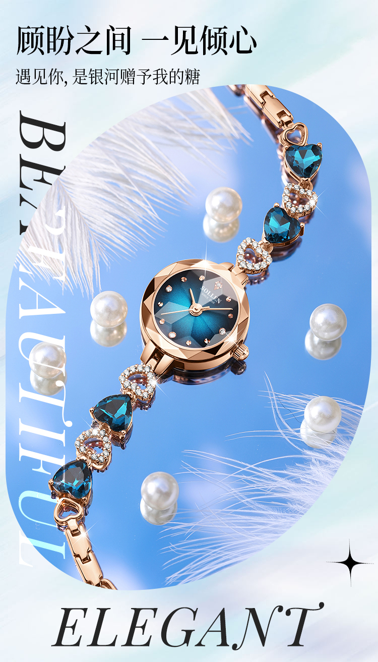 【设计创意】:顾盼之间,一见倾心,菱形镜面时刻闪耀,搭配蓝色爱心表链,如同诉说着甜美的事物。