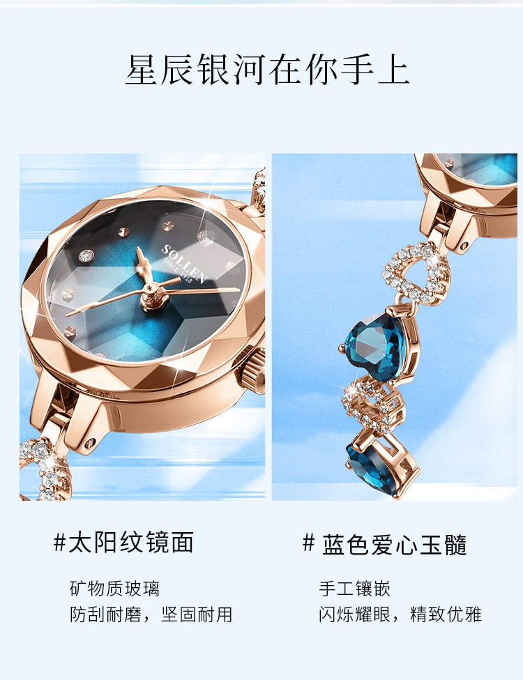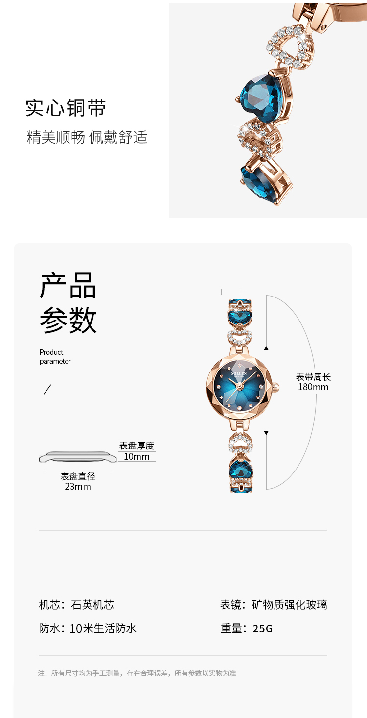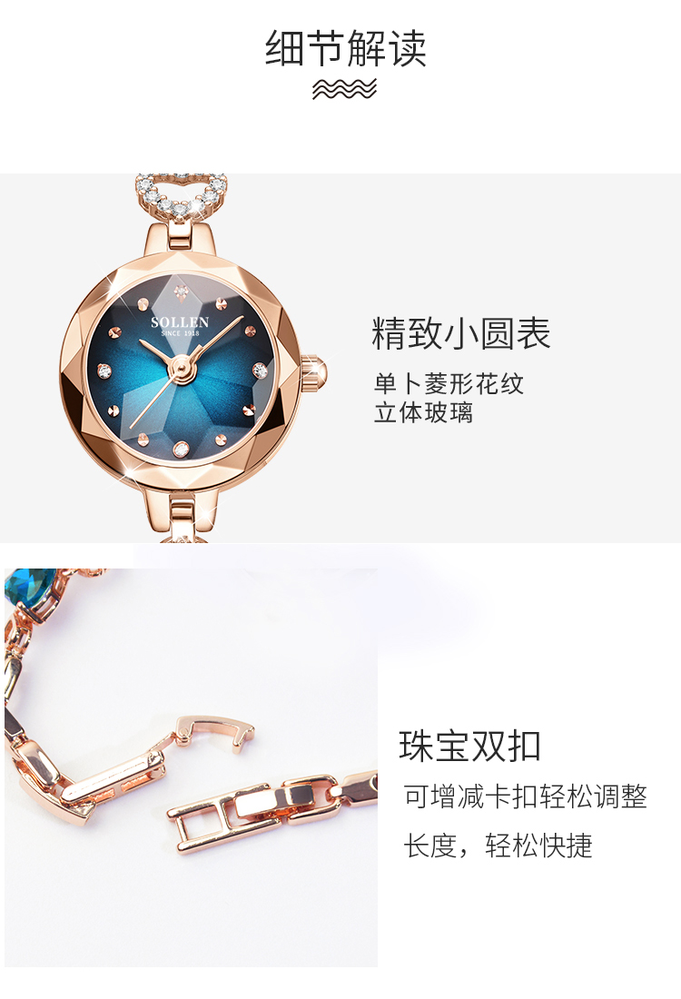 【材质工艺】:石英机芯,让走时更加精准,矿物质强化玻璃镜面让手表更加透彻明亮,珠宝扣手链表带摘戴方便,及解及戴