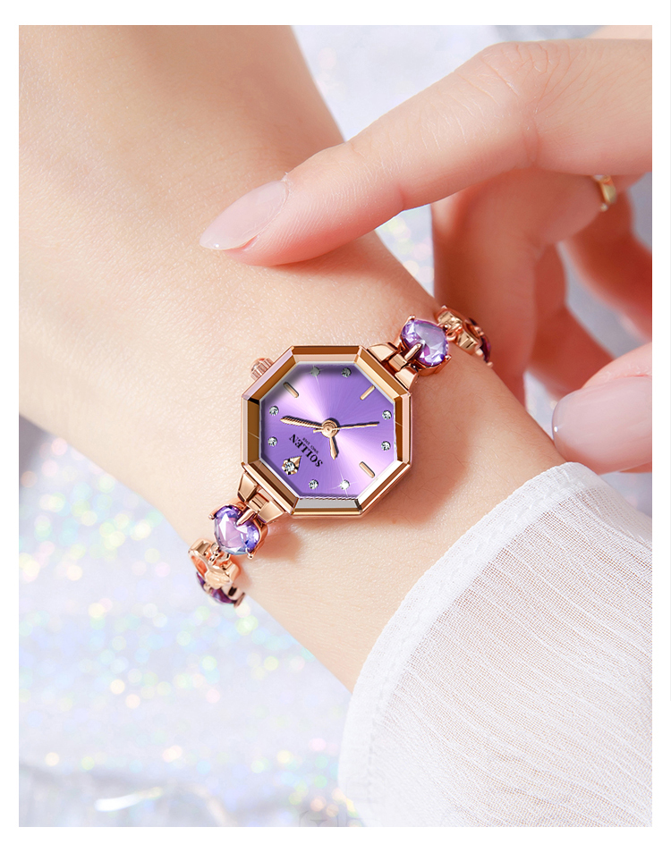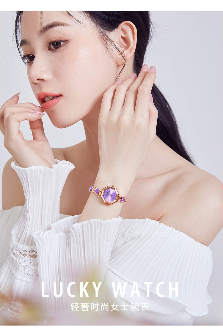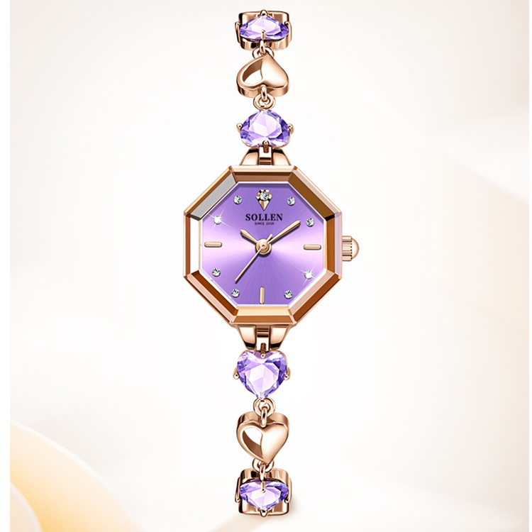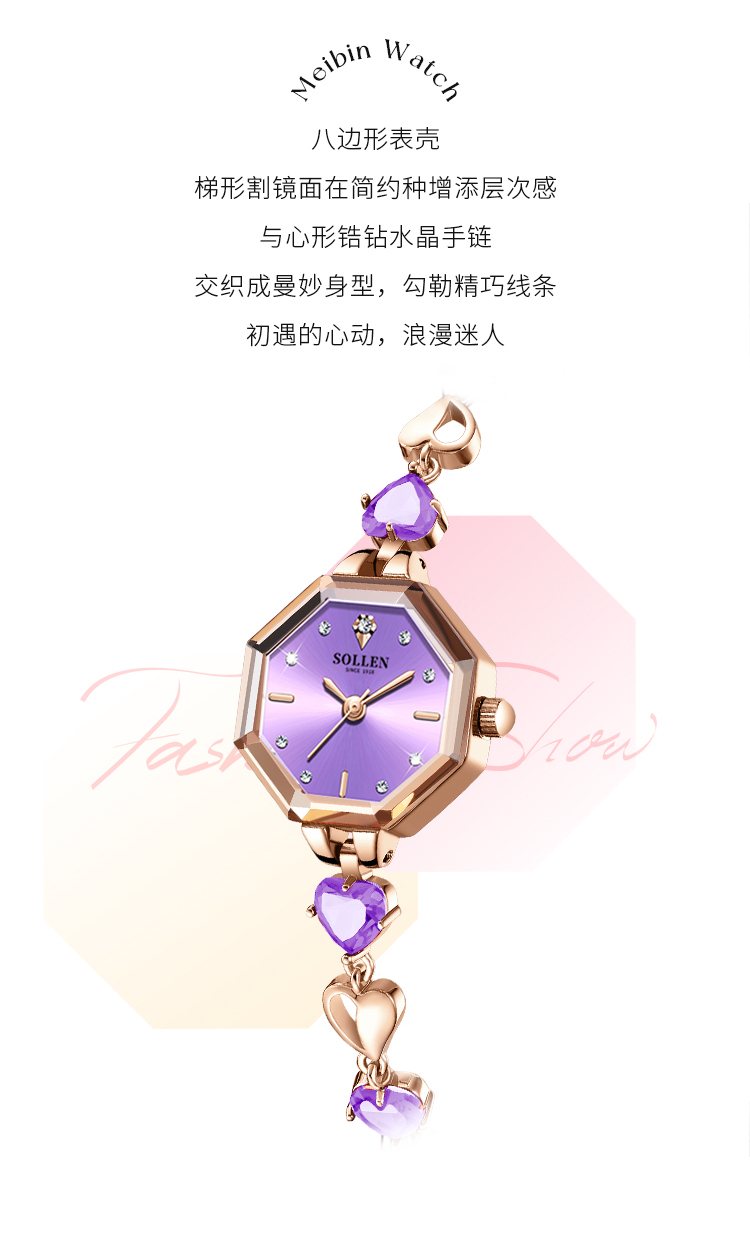 【设计创意】:独特的八边形表壳,梯形切割镜面在简约种增添层次感与心形紫色心形手链交织成曼妙身型,勾勒精巧线条如同初遇的心动,浪漫迷人