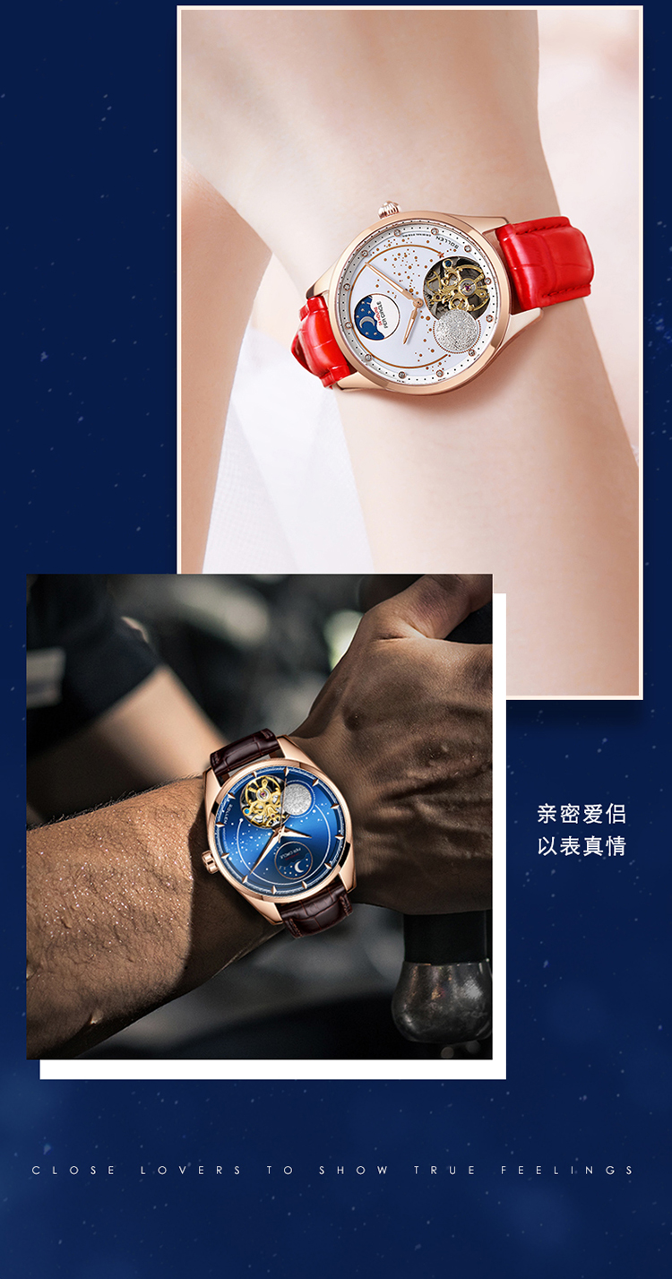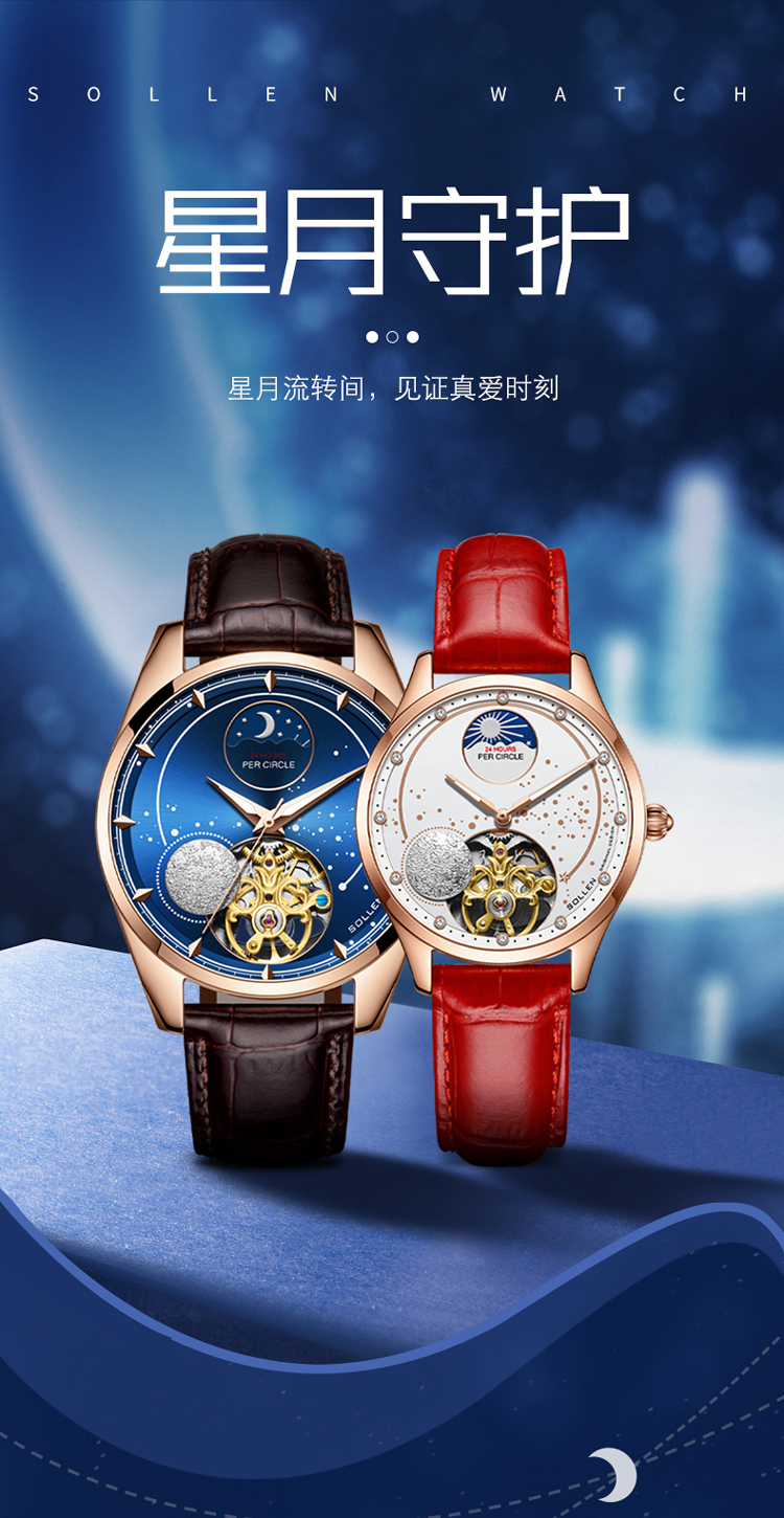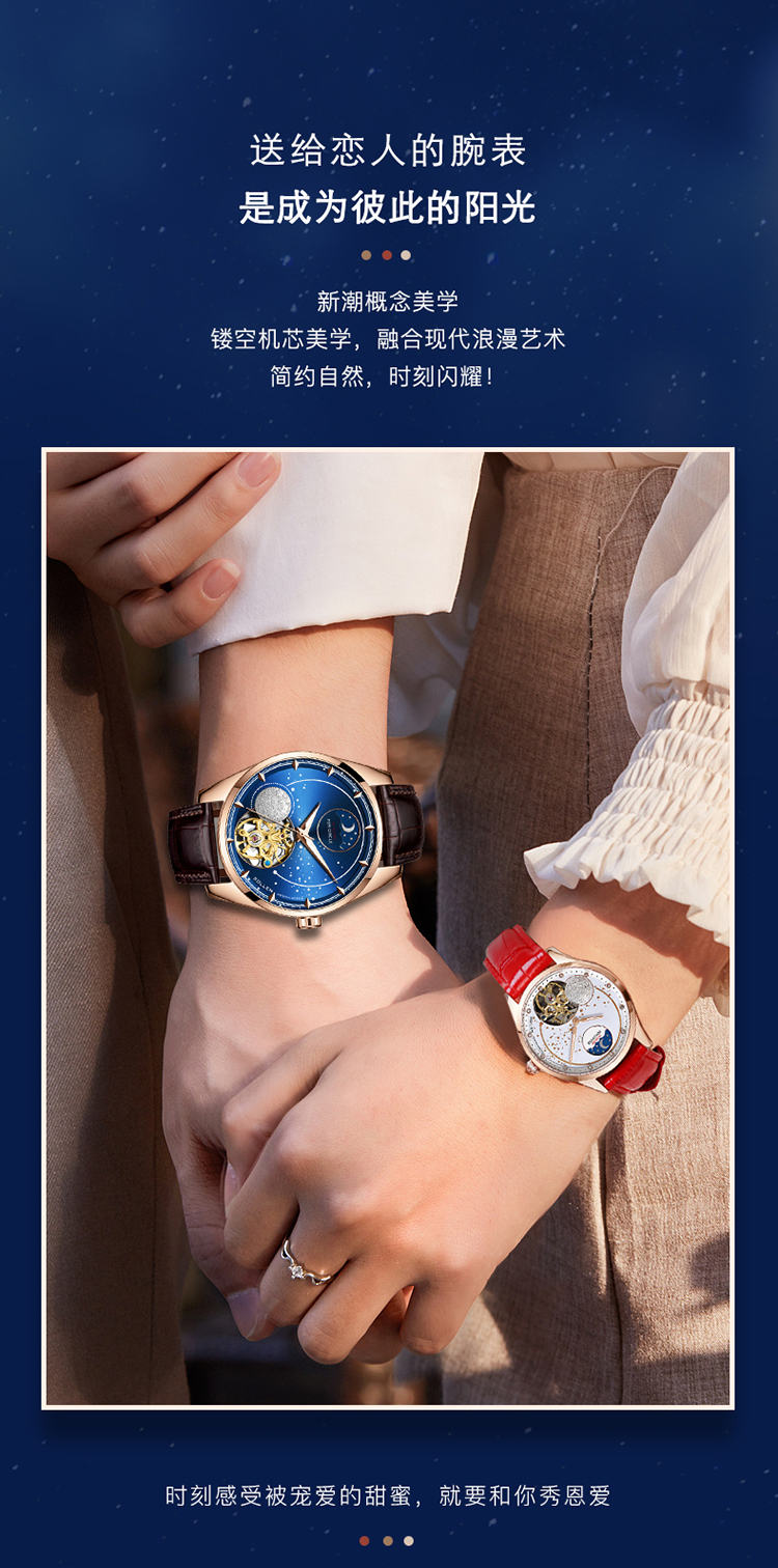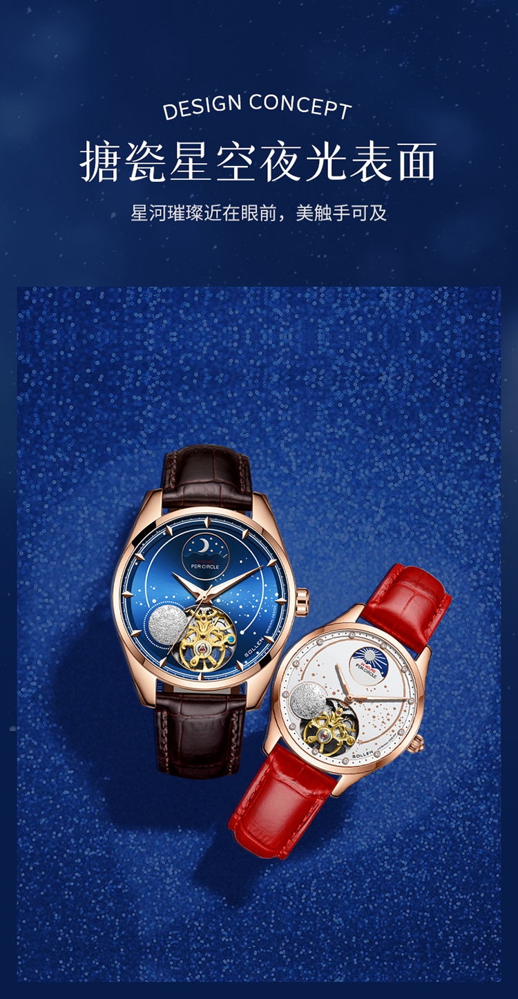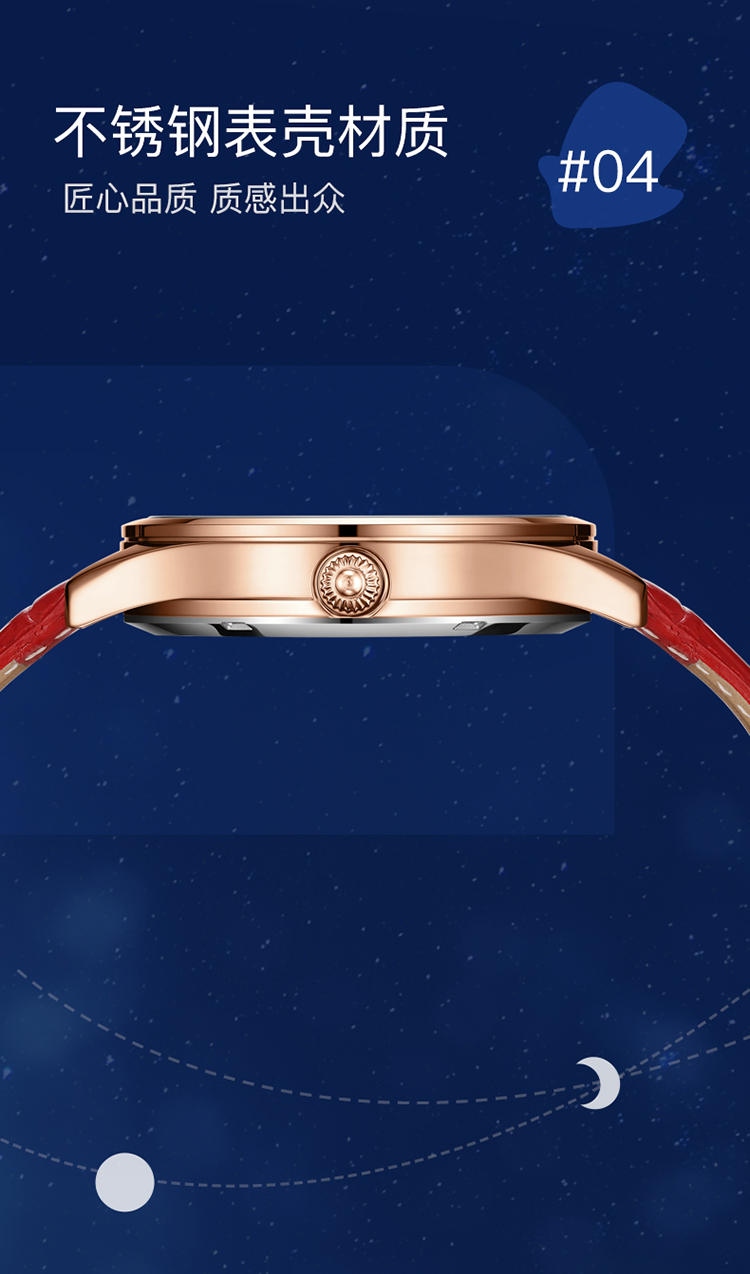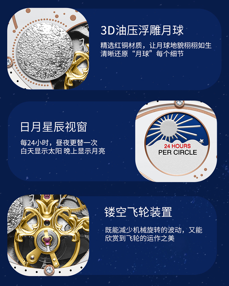 【款式卖点】:搪瓷星空表面,镶嵌着12颗犹如月亮形状的合成立锆刻度,12点位置是日月星辰橱窗,沉浸月相大视窗,全新的视觉体验,8点位置的3D油压浮雕银色月球与6点位置的镂空机械装置相应和