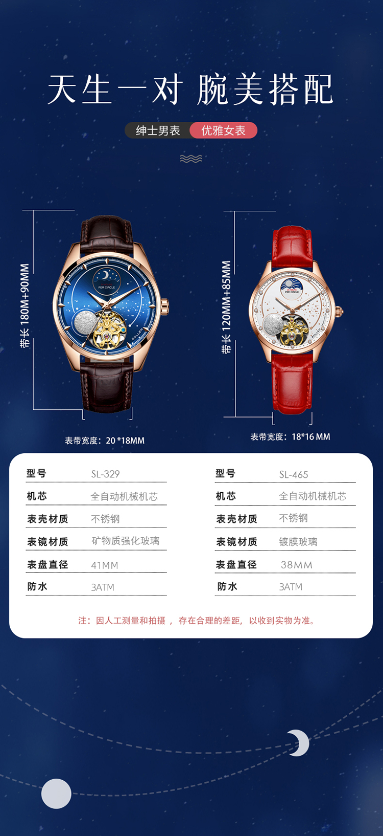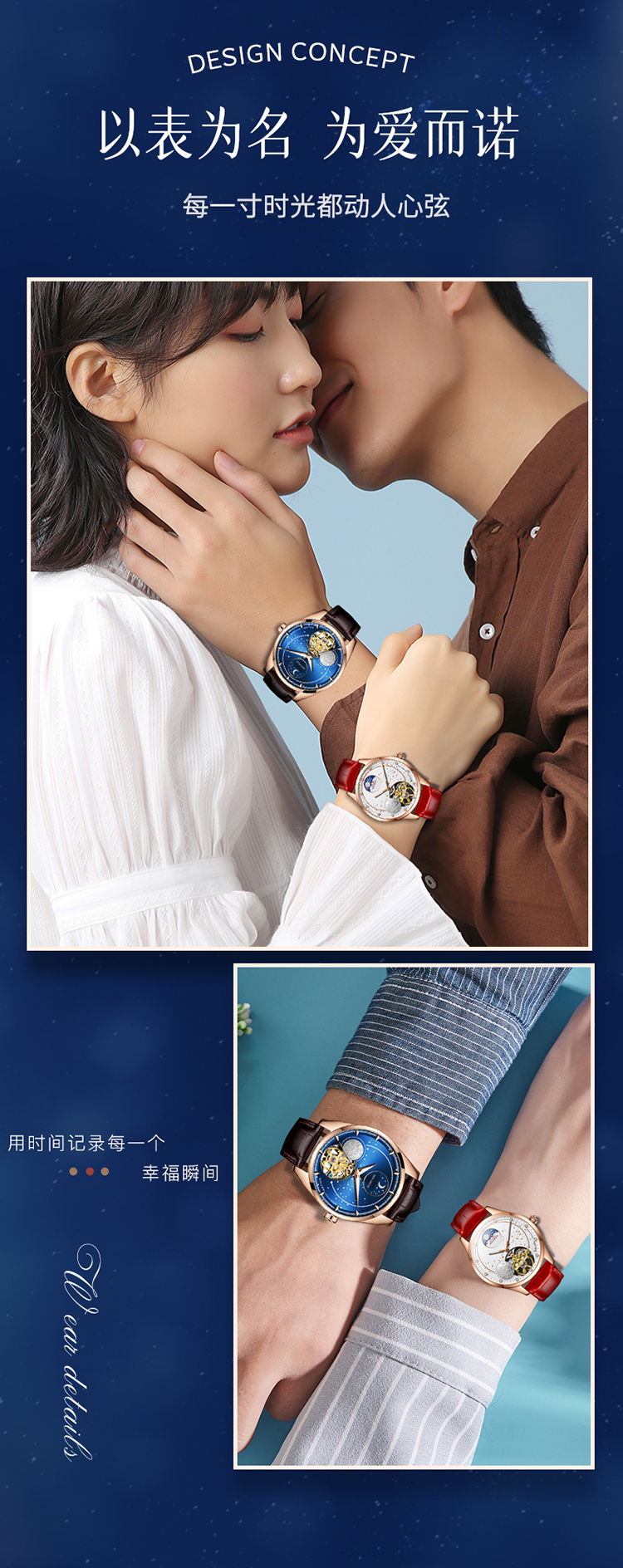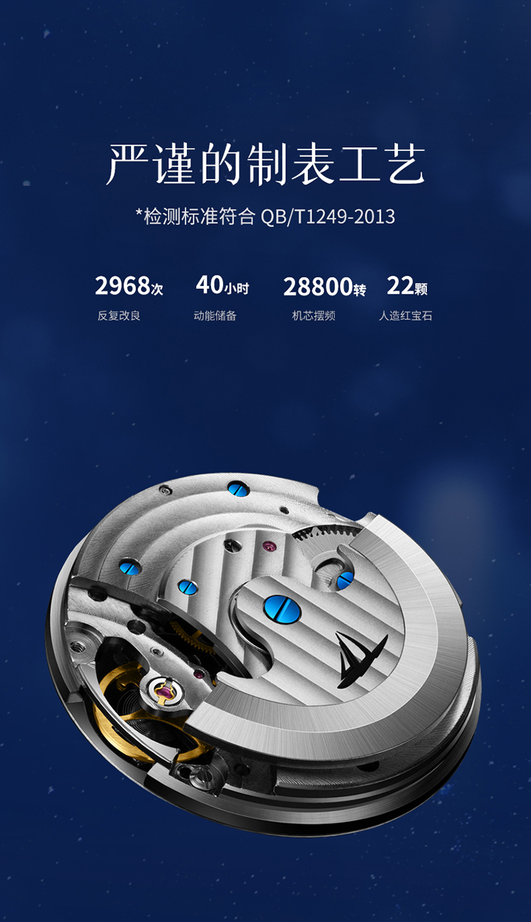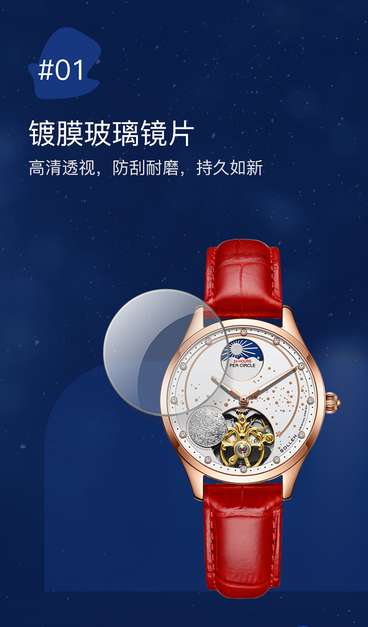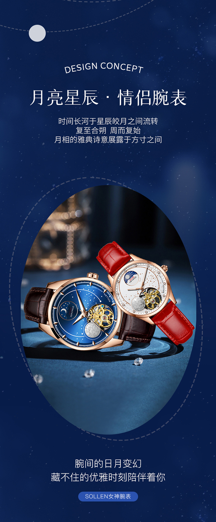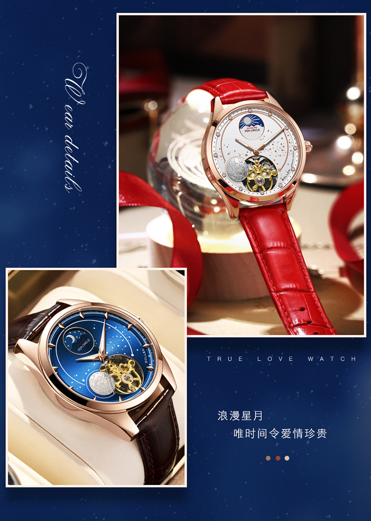 【款式卖点】:搪瓷星空表面,镶嵌着12颗犹如月亮形状的合成立锆刻度,12点位置是日月星辰橱窗,沉浸月相大视窗,全新的视觉体验,8点位置的3D油压浮雕银色月球与6点位置的镂空机械装置相应和