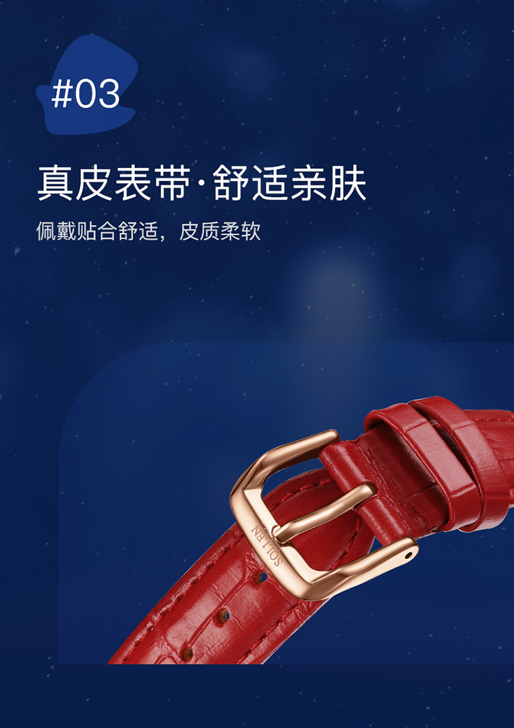 【材质工艺】:镀膜玻璃镜面,高硬度高清透视。不锈钢表壳材质,精密的锻造工艺,匠心品质,质感出众。牛皮表带,舒适贴合手腕弧度,柔韧轻盈。