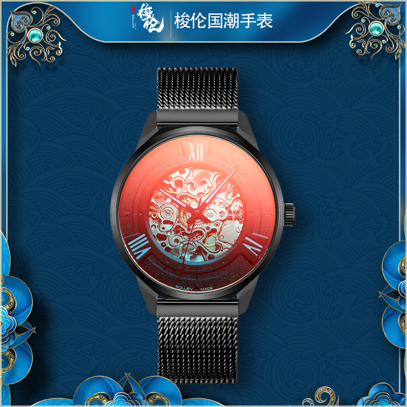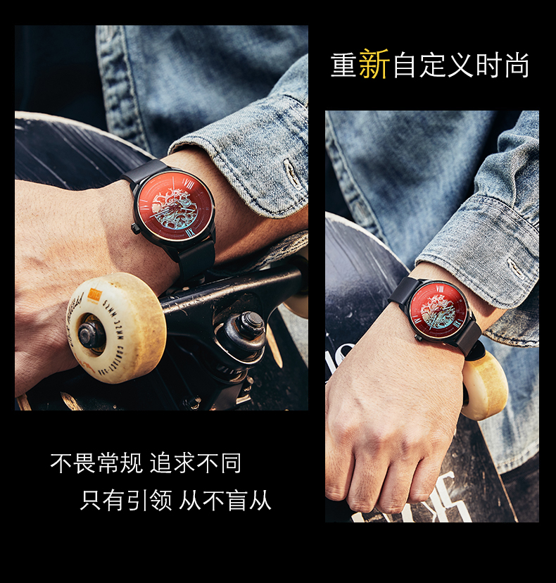 【设计创意】:专门为新潮男打造的一款街头嘻哈风机械表,特有的幻彩玻璃与双面镂空设计,充满潮流与运动气息和活力