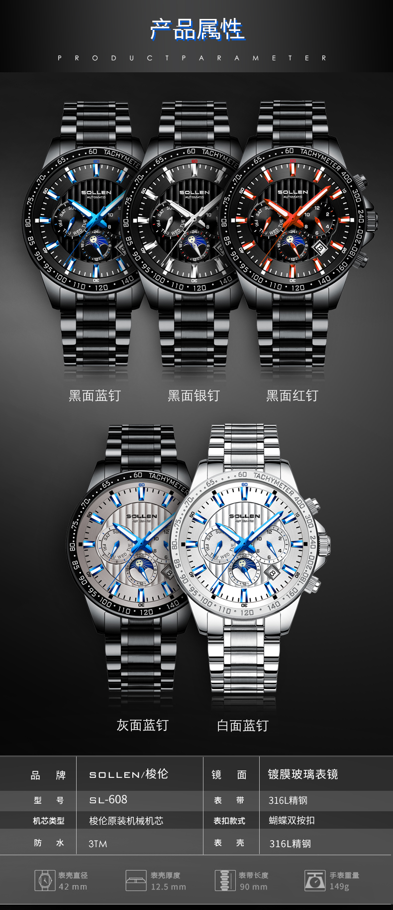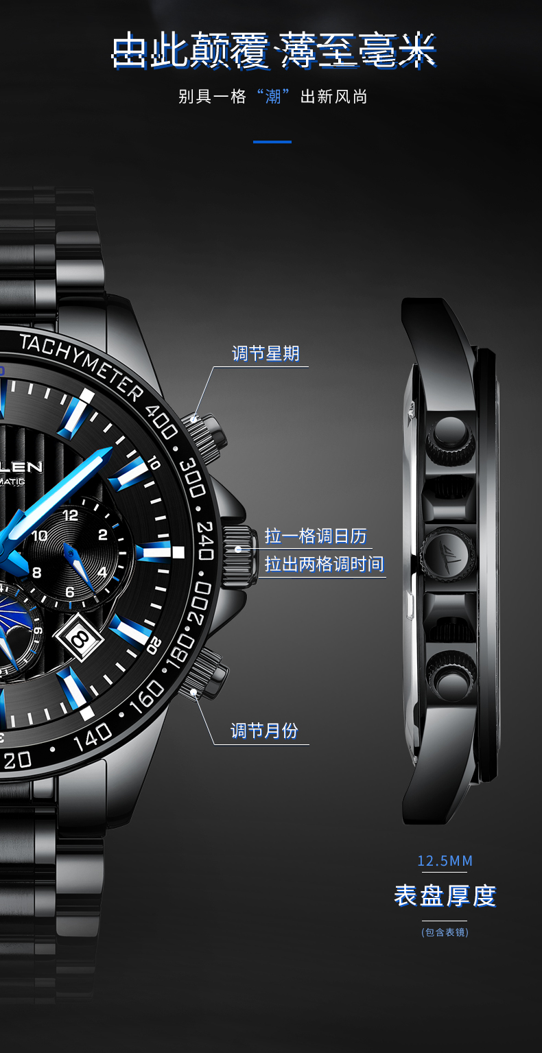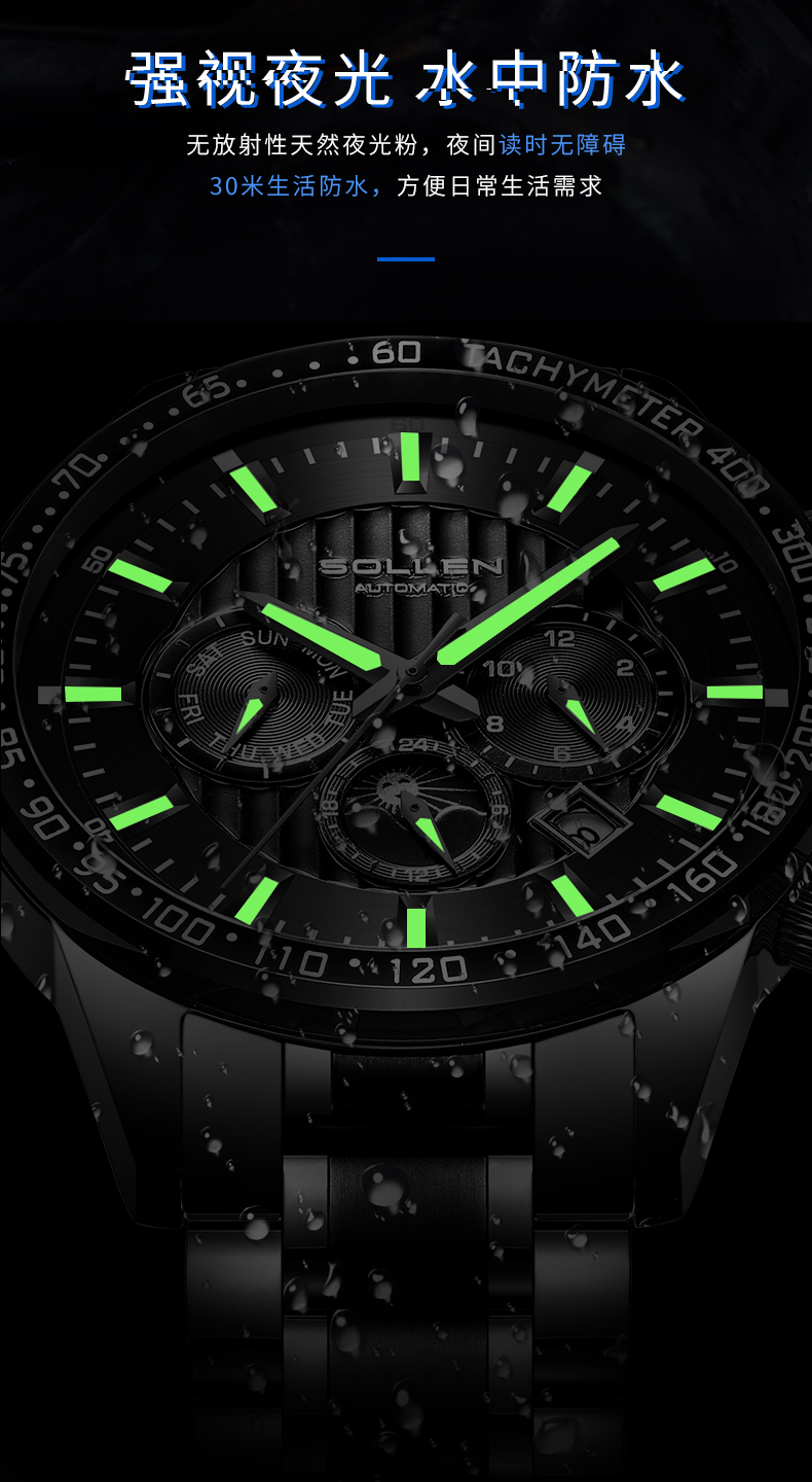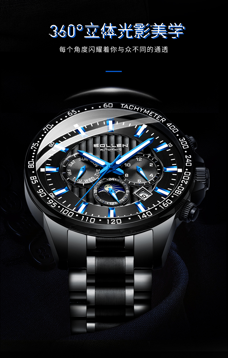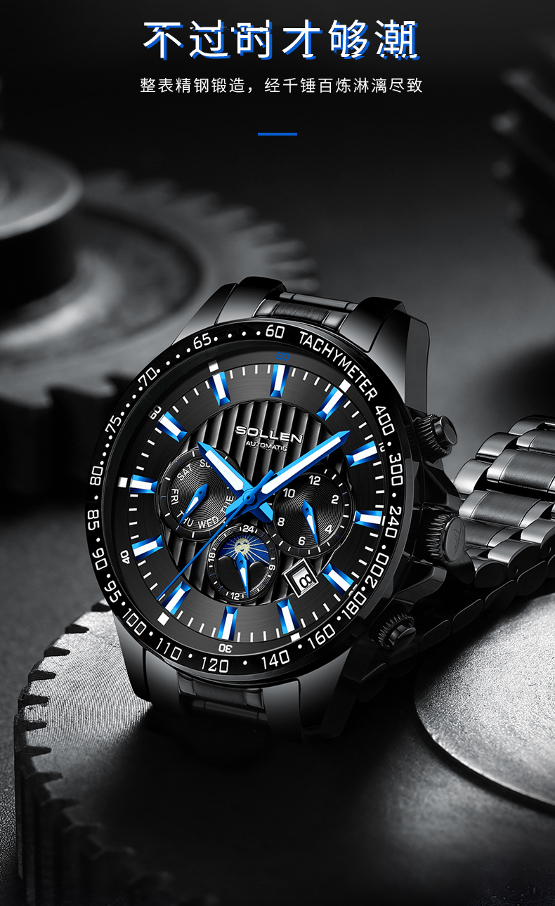 【SL608】梭伦潮流多功能钢带全自动机械男表