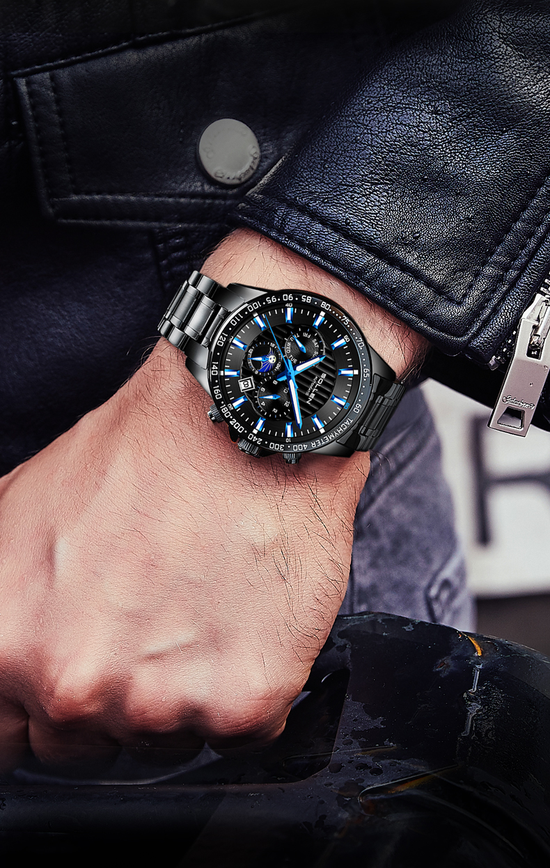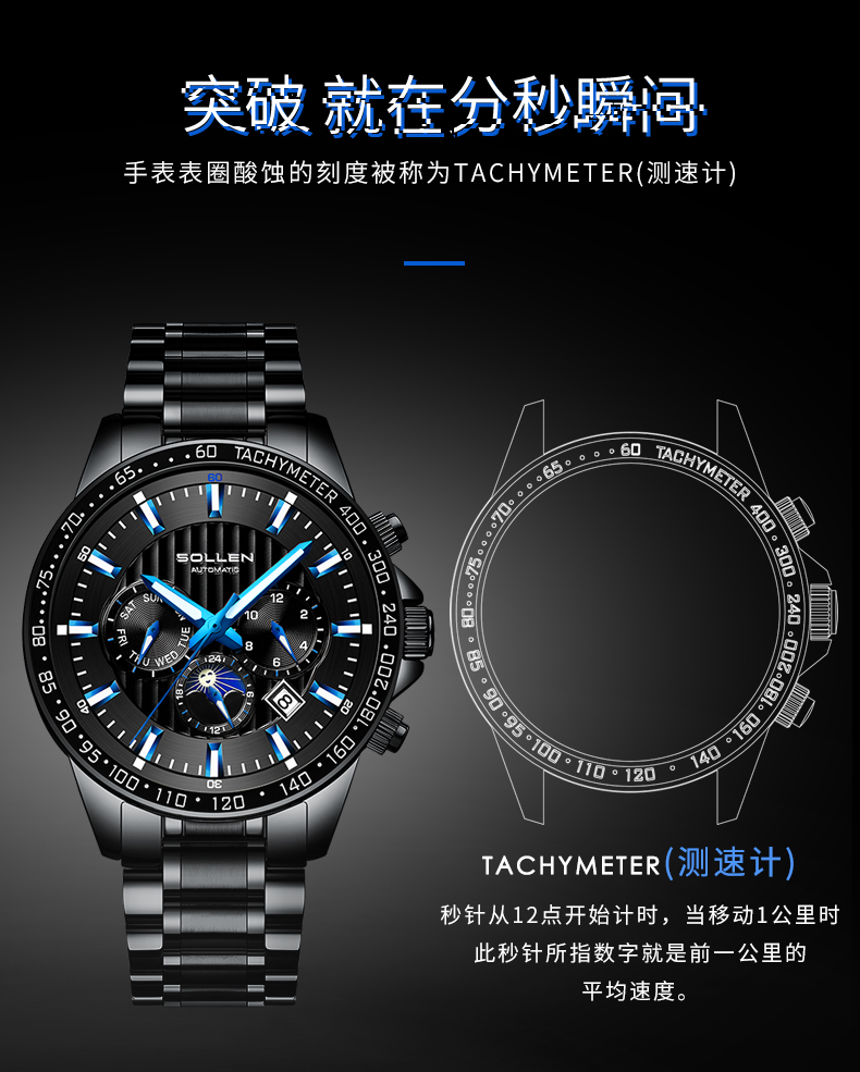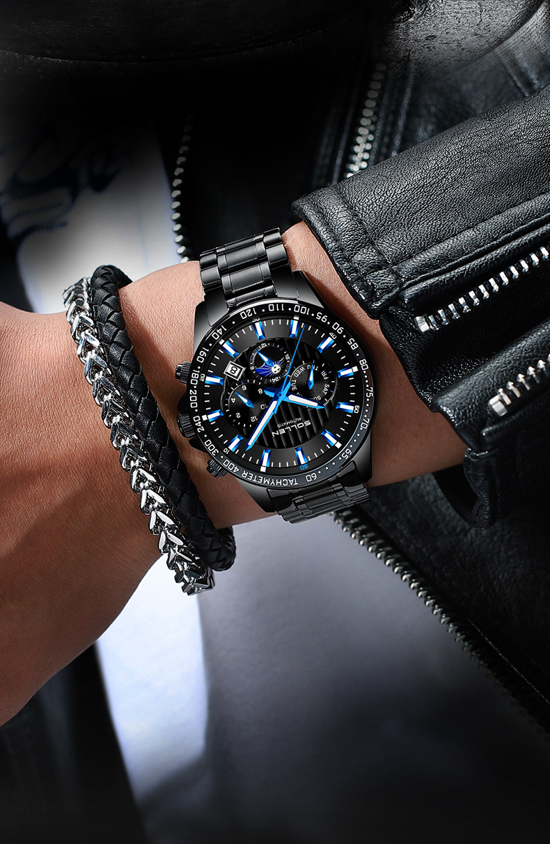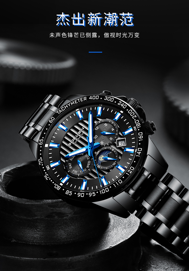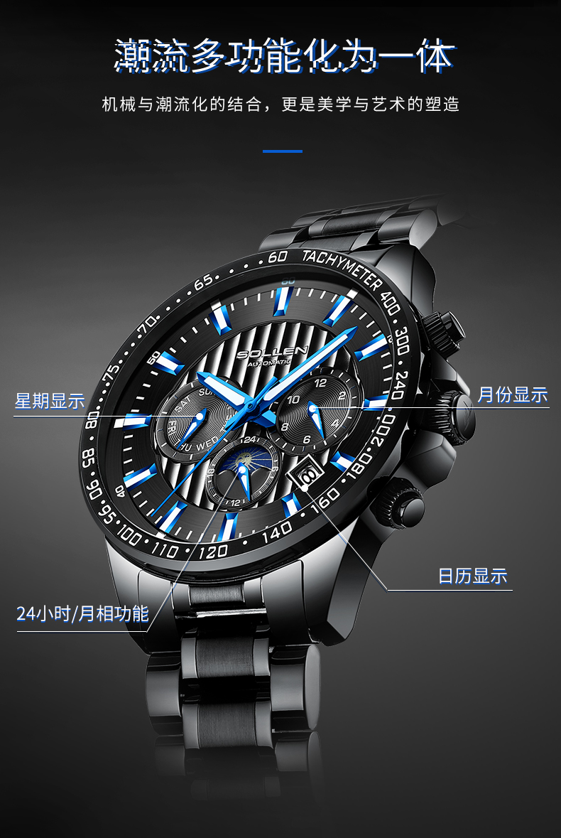 1.梭伦原创设计多功能运动型男风格钢带机械表,街头与户外型男必备腕物!整体的风格刚硬,充满运动气息和活力。