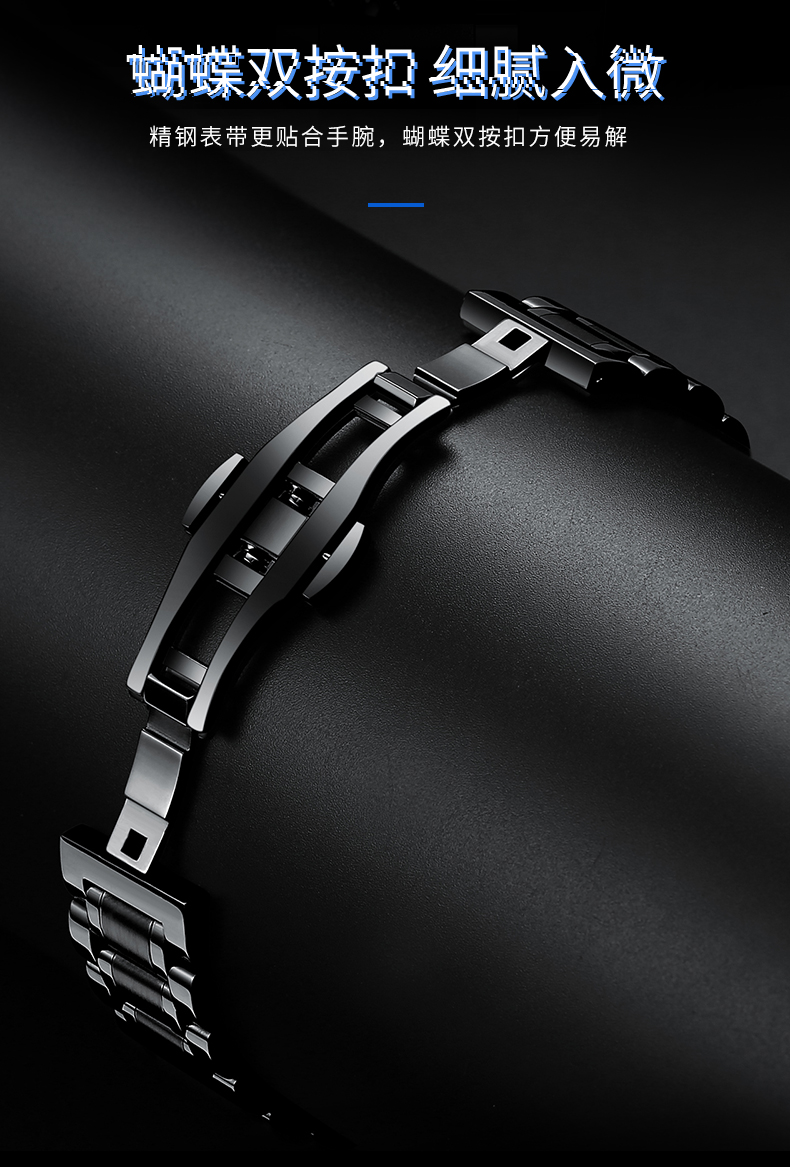 4.配置精选不锈钢材质制造的实心钢带,锻造蝴蝶式双按扣,轻松便捷,一按解扣。