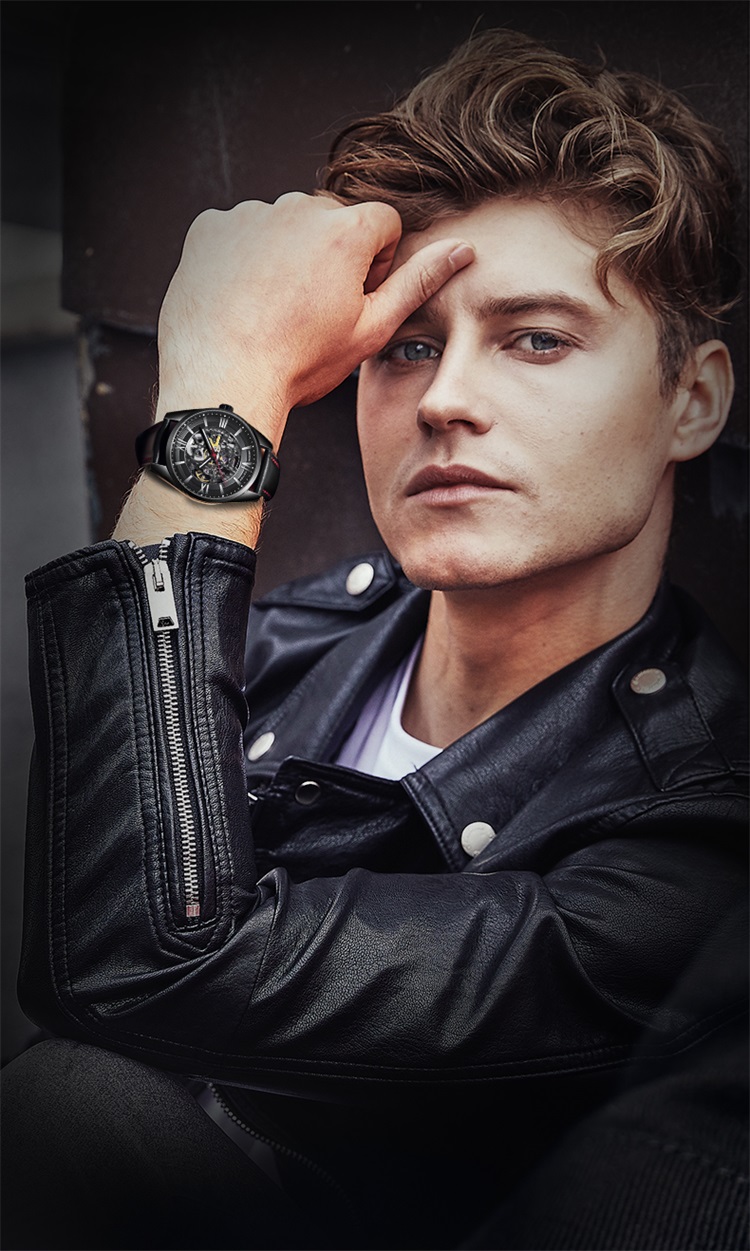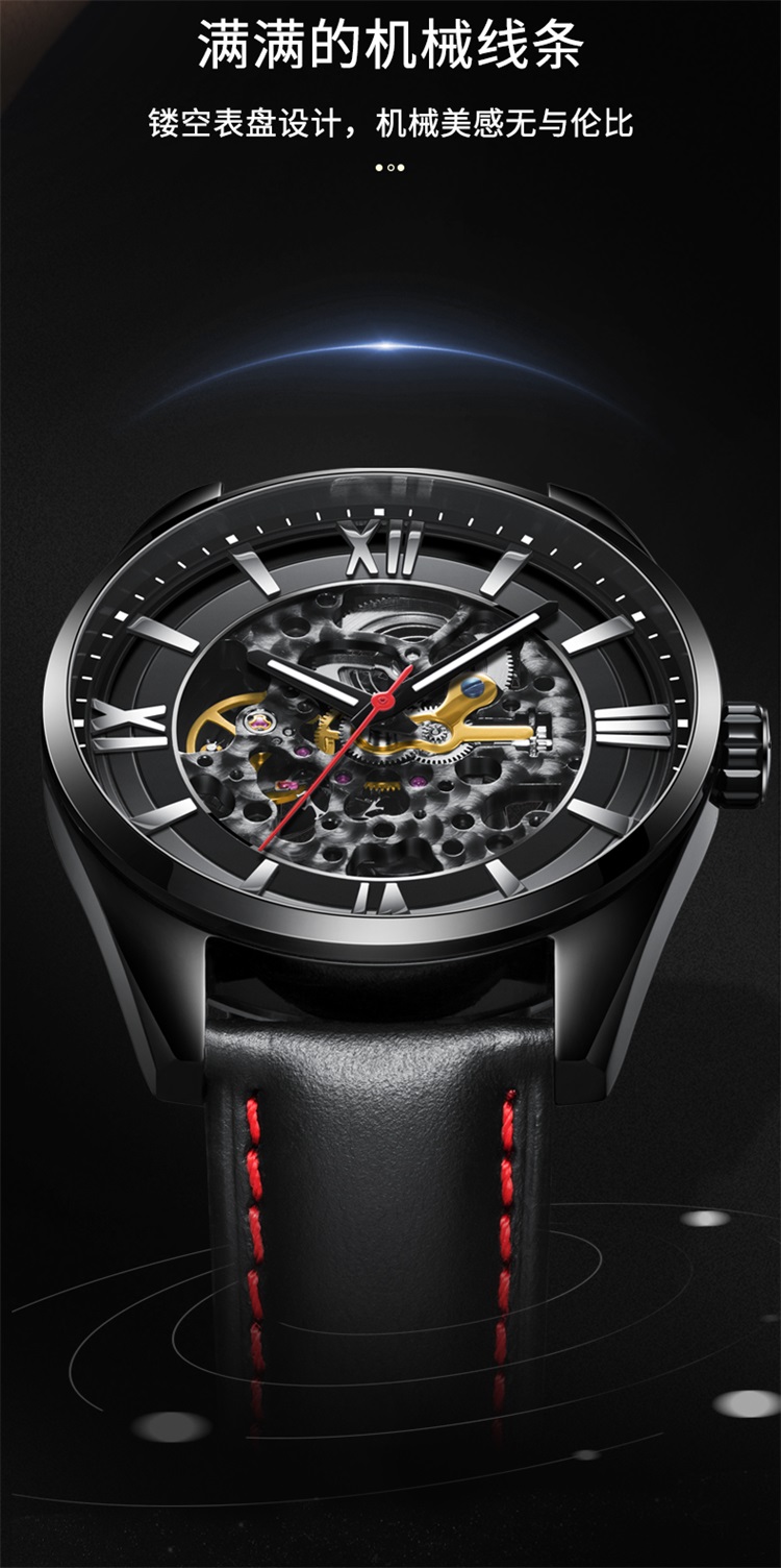 3.头层牛皮表带,冷峻不羁的全黑色点缀红线,佩戴起来更显活力和硬朗,百搭日常服饰