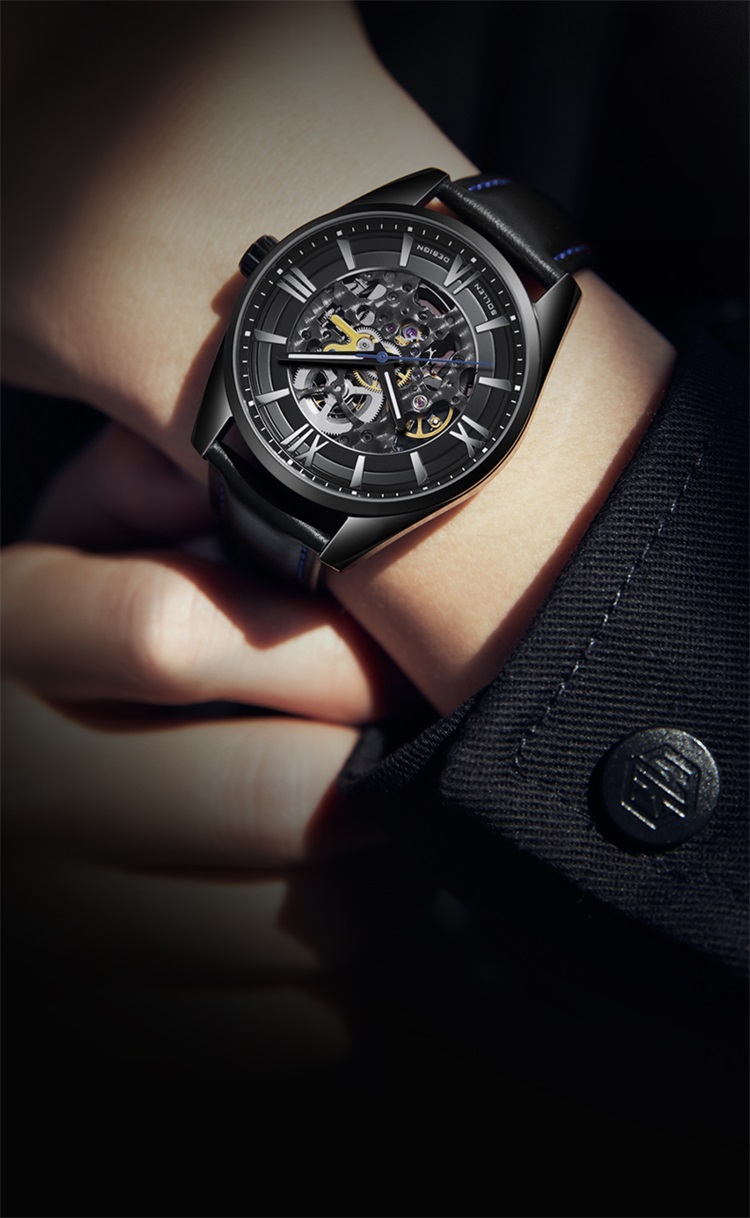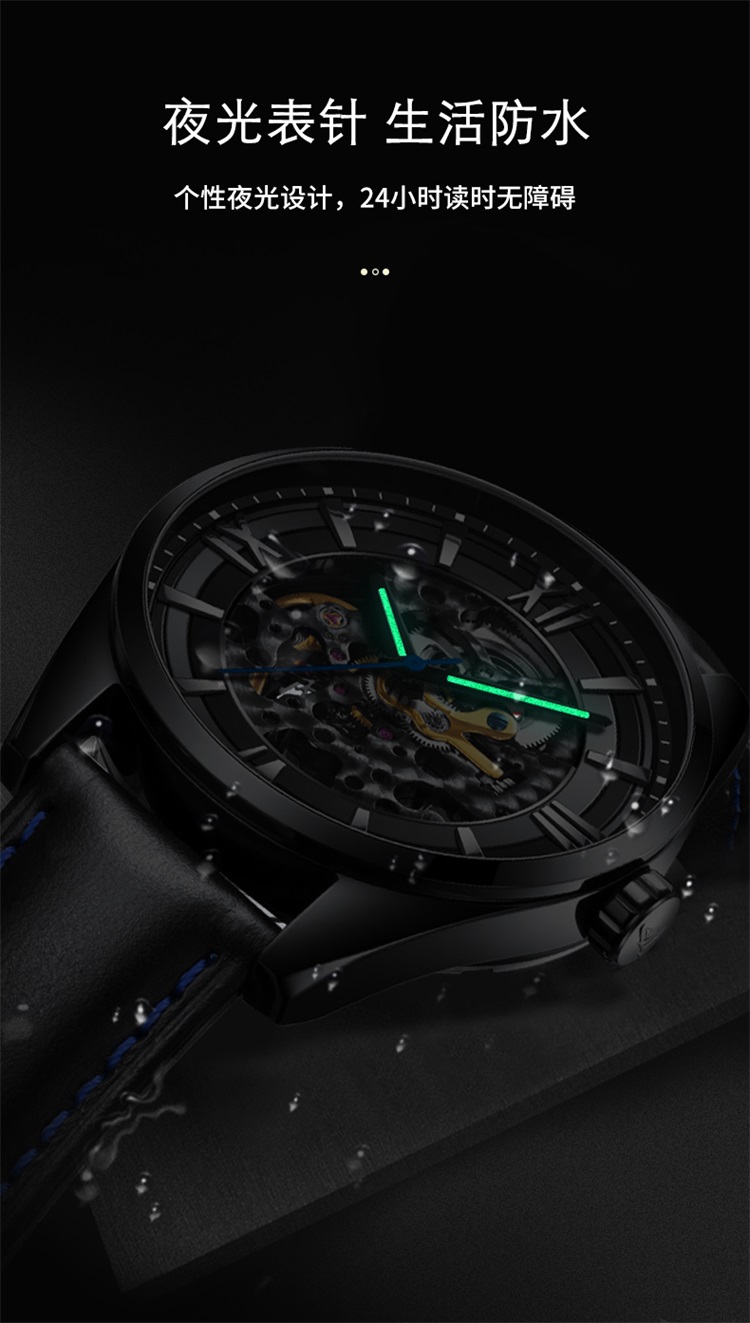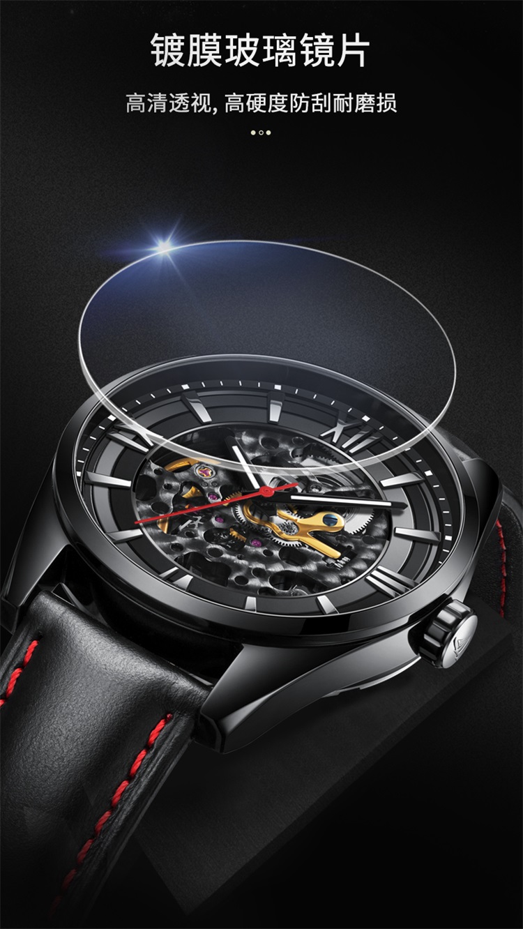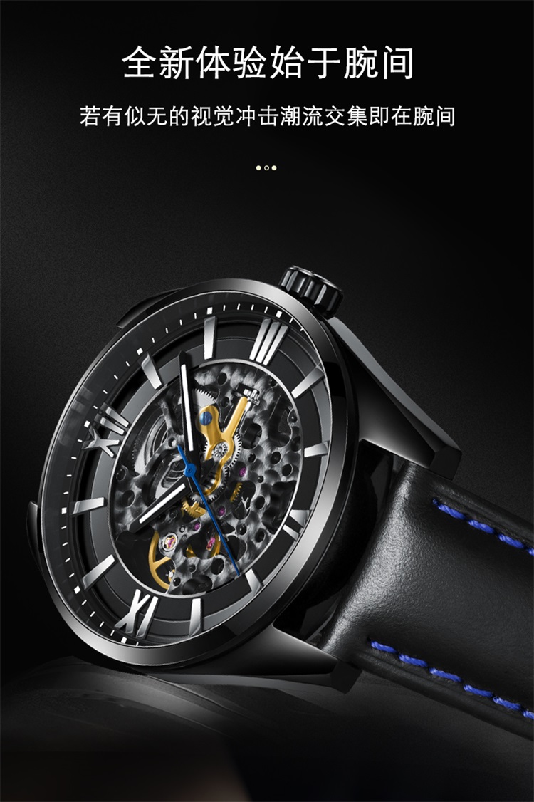 1.大三针功能,双面雕花镂空机芯,齿轮起承转合,唤醒繁复有术的内芯深处,肉眼感受机械表的律动与美