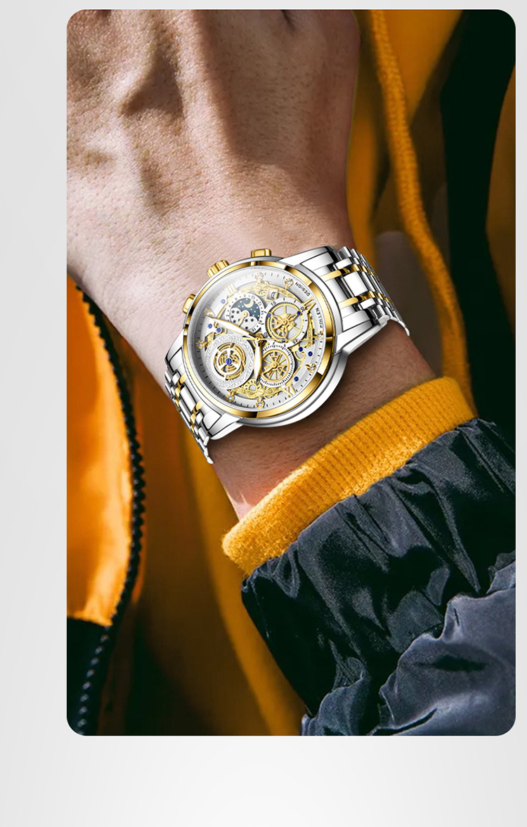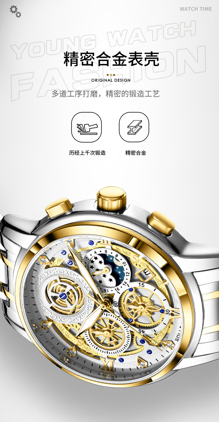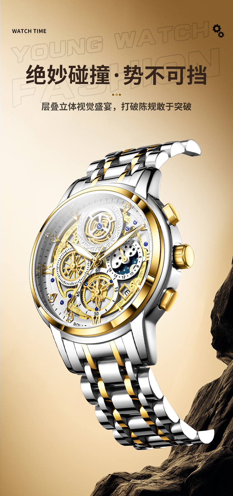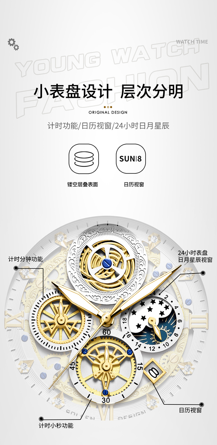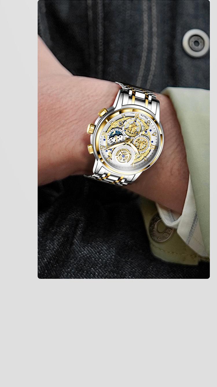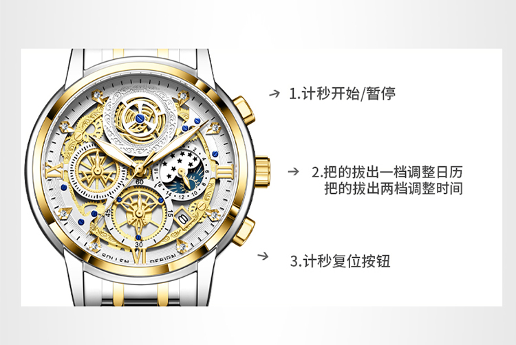 1、表盘设计匠心独运,层次分明,错落有致,宛如一幅精心雕琢的微型立体画卷,以其独特的设计、精准的走时、卓越的材质,完美诠释了何为“至臻”与“魅力”完美结合的男士石英手表。