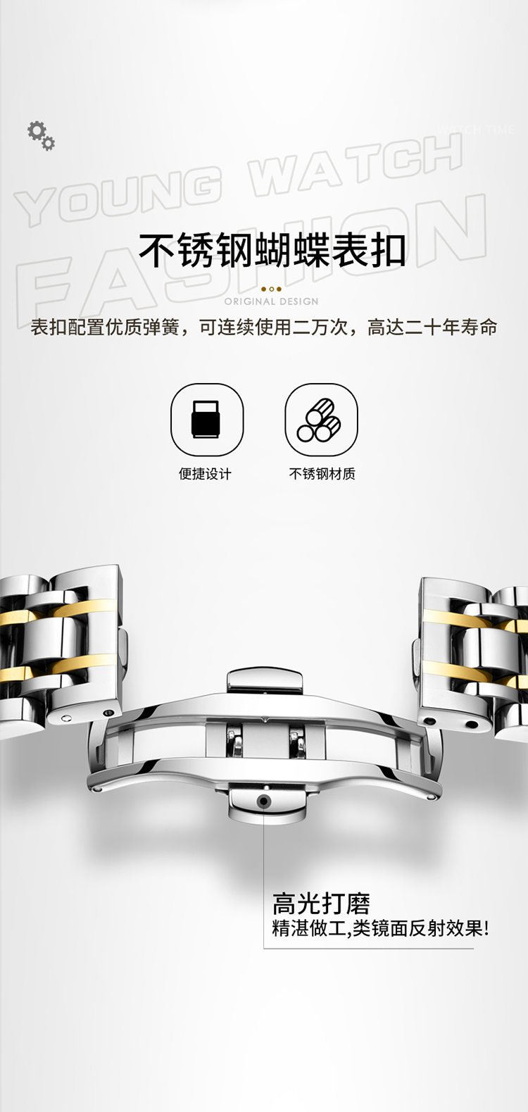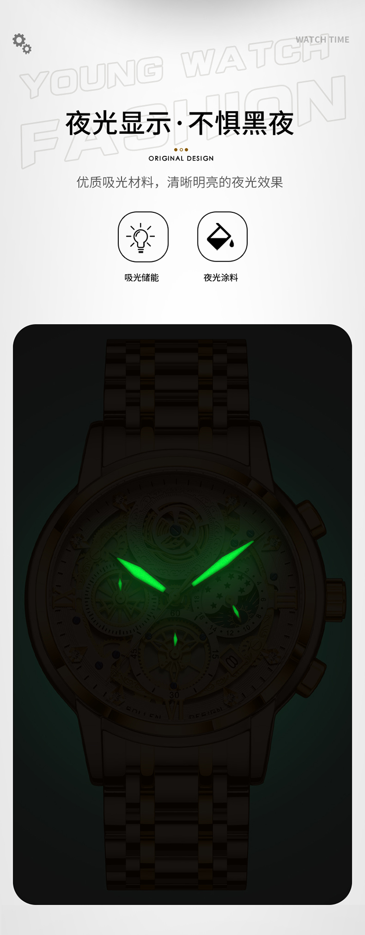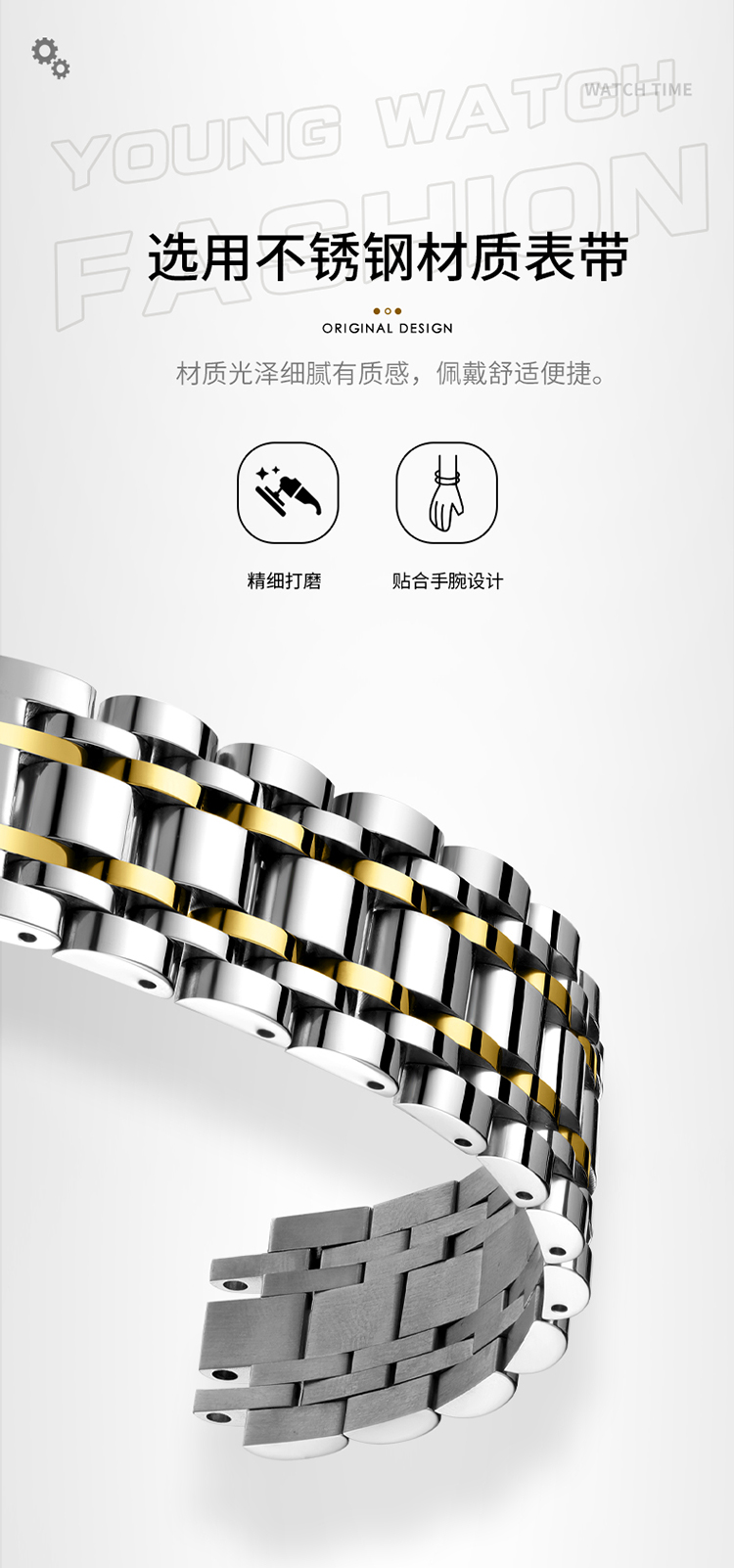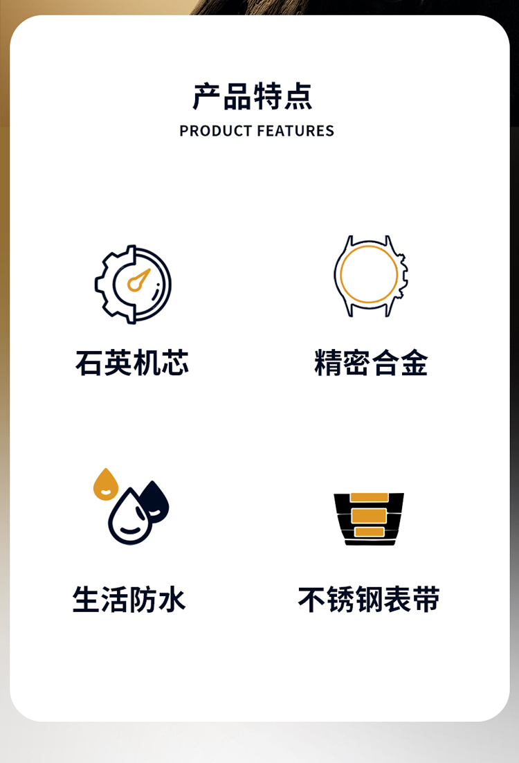 3、石英机芯的采用,确保了这款手表走时的精准,每一秒的跳动都是对品质的坚守与承诺。精选不锈钢表带,冷冽中透露出不凡的质感,与肌肤接触的瞬间,便能感受到那份细腻与舒适