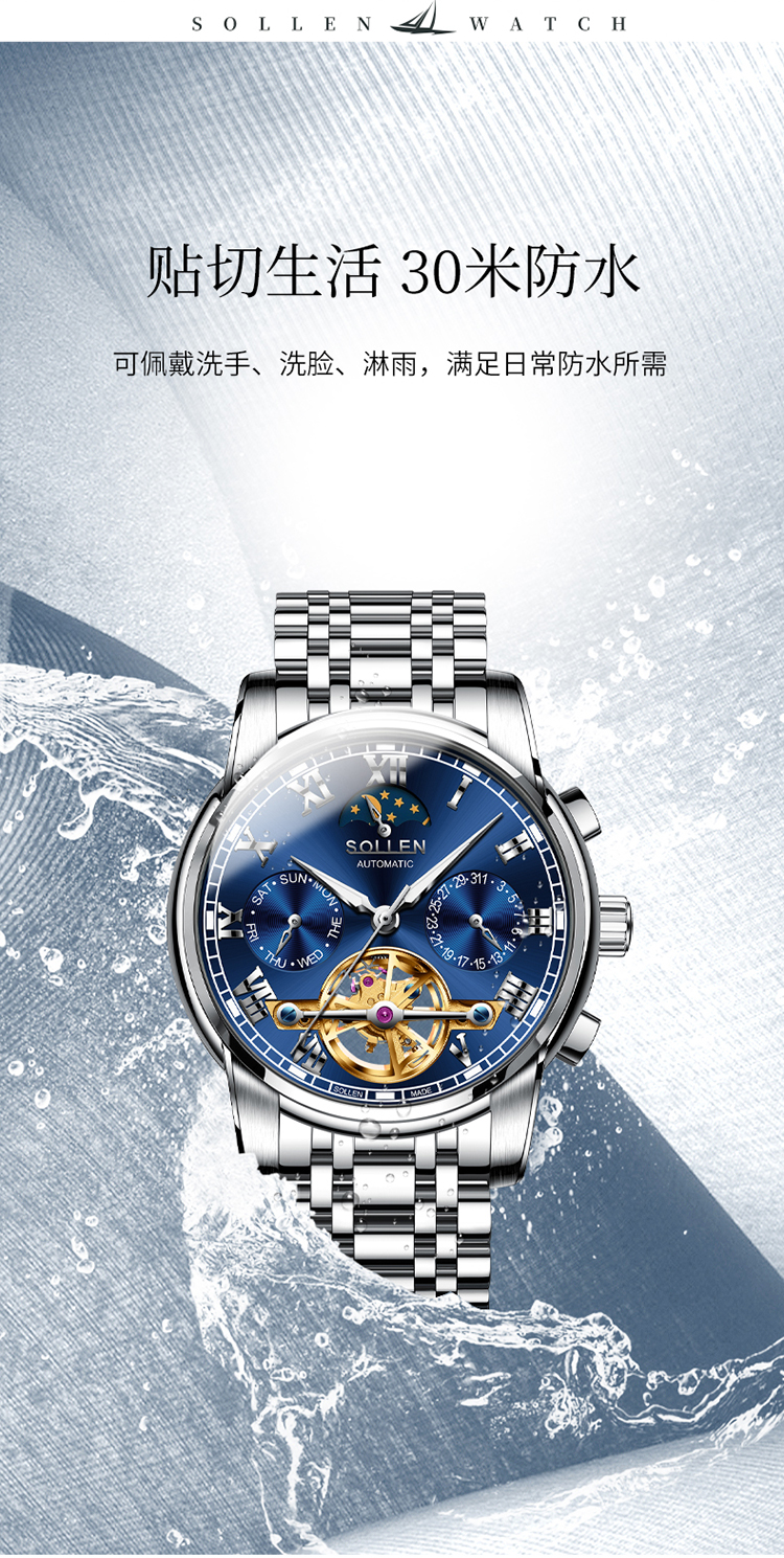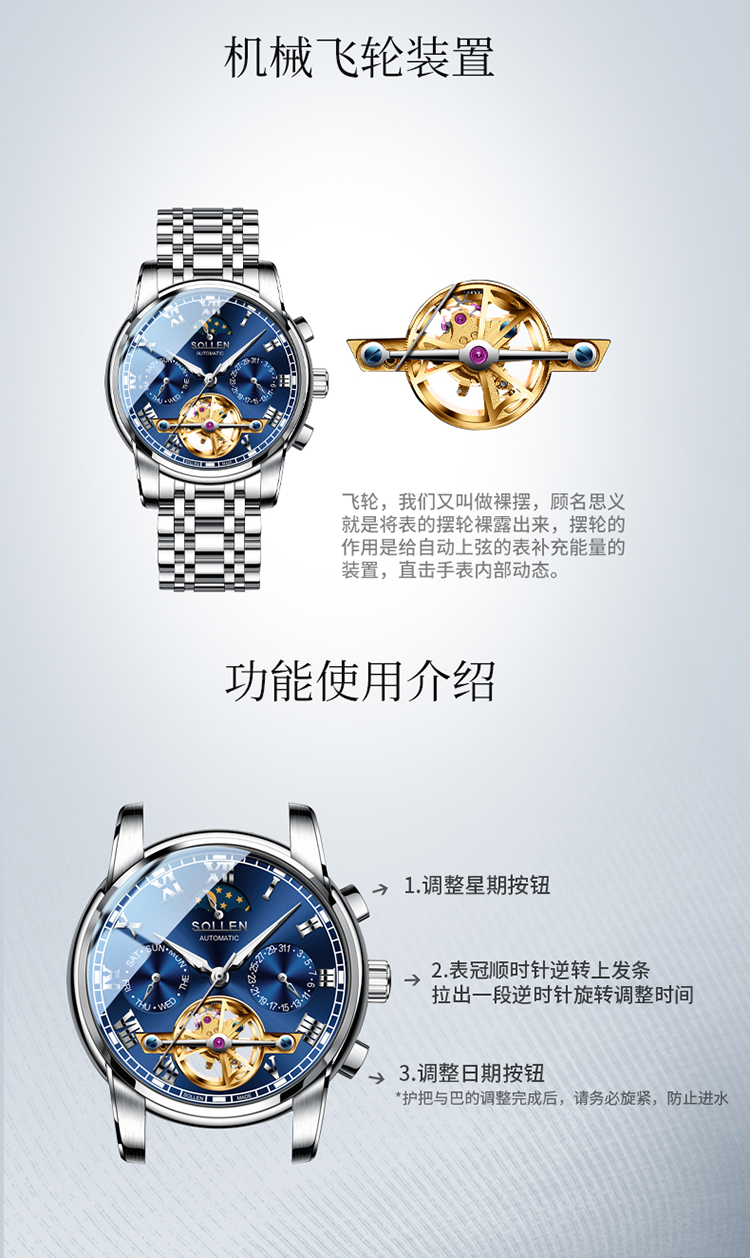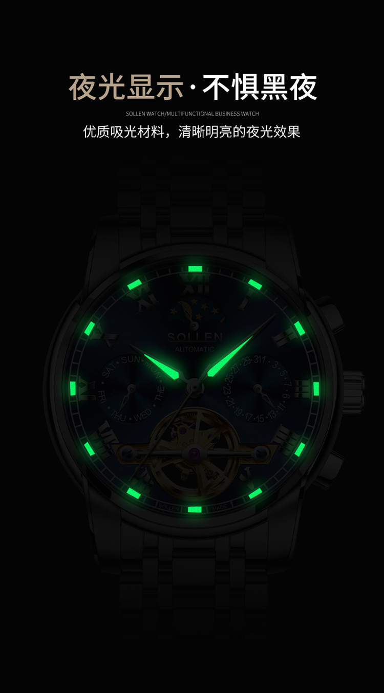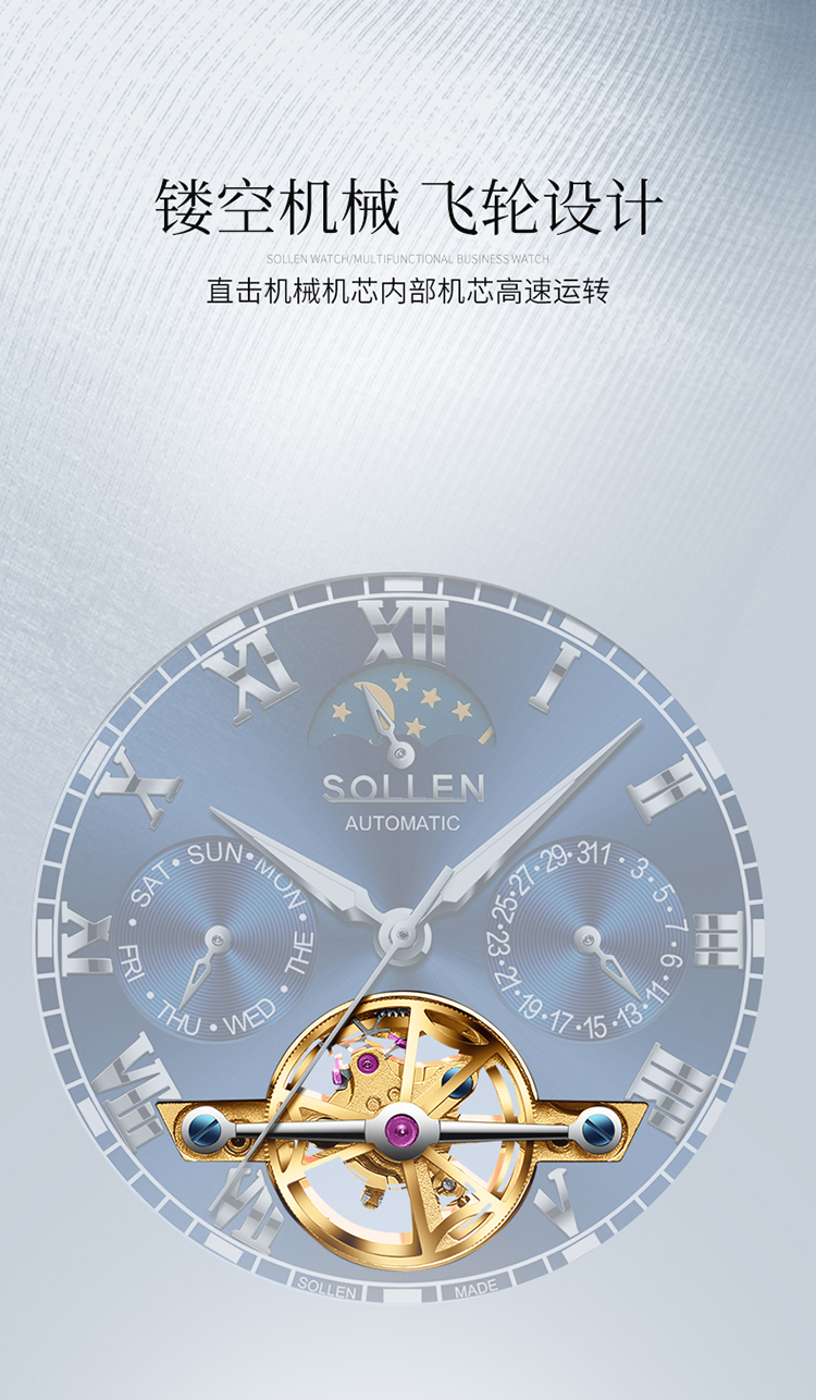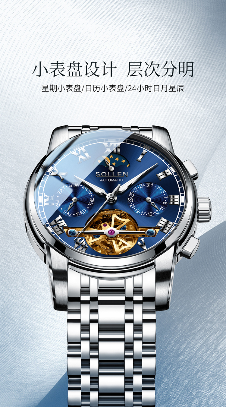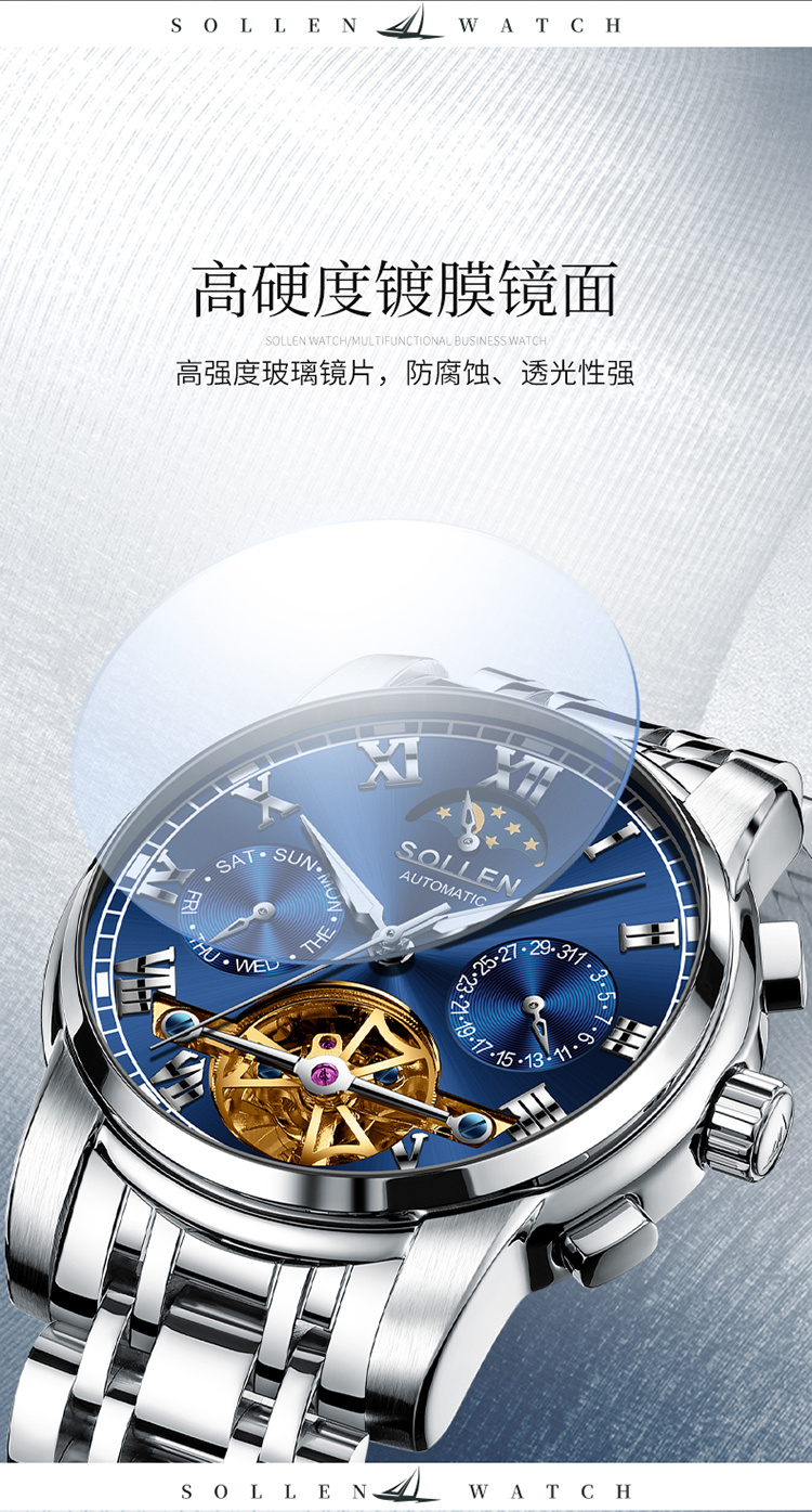 【材质工艺】:6针多功能机芯,3点日历功能 6点镂空飞轮 9点星期功能 12点24小时加月相功能,镀膜玻璃表镜防刮耐磨,实心不锈钢带,厚重而显质感,拿在手里就能感受到它的份量!