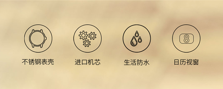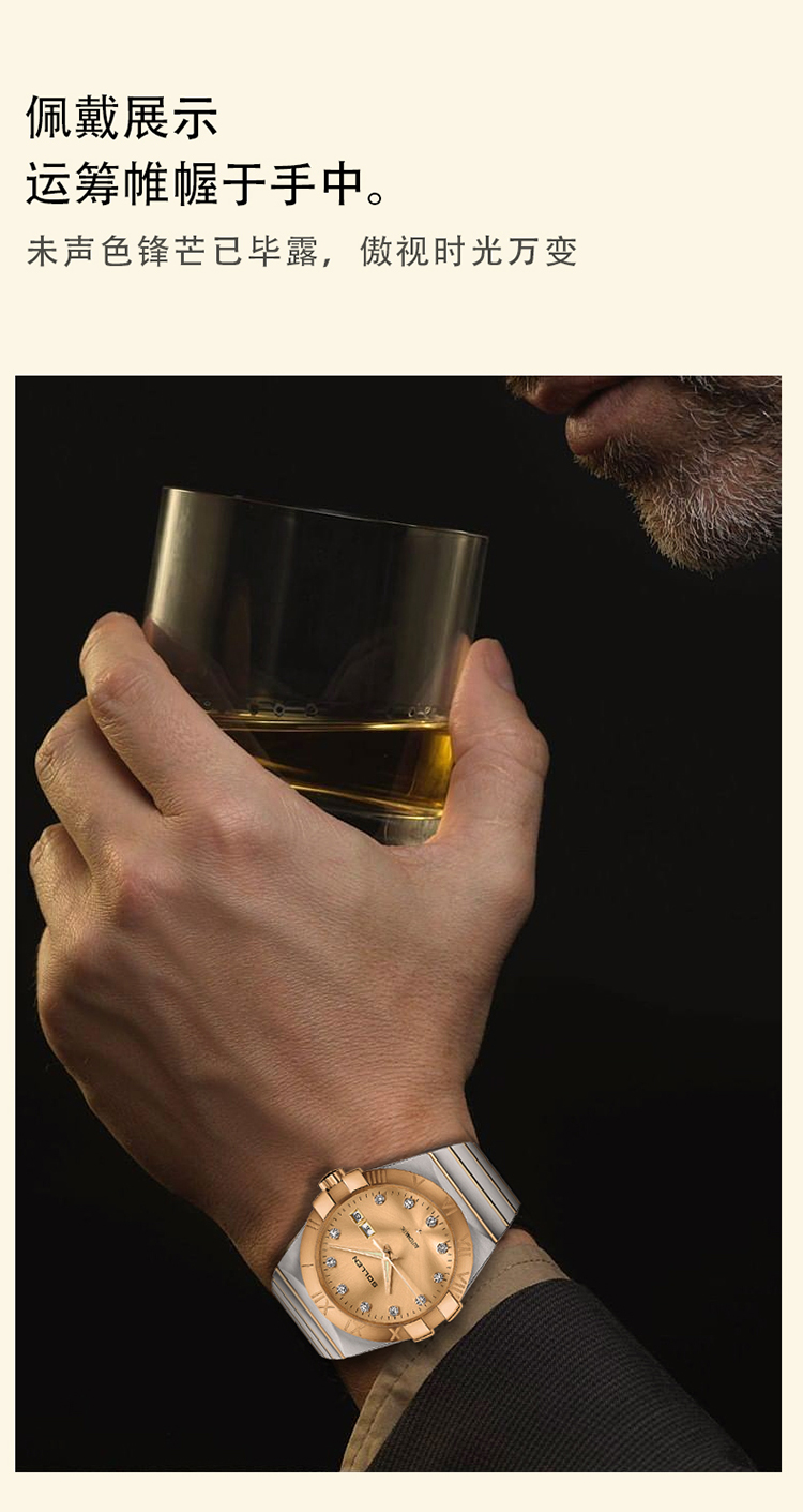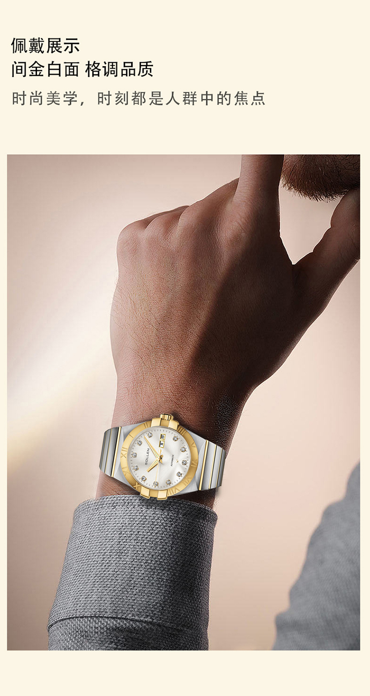 39mm精钢表配备镌刻罗马数字的黄金色表圈,金色表面配12颗锆石镶嵌,高级耐看。表带是间金钢带,上手有一种低调的奢华感,寓意着有进有赚。