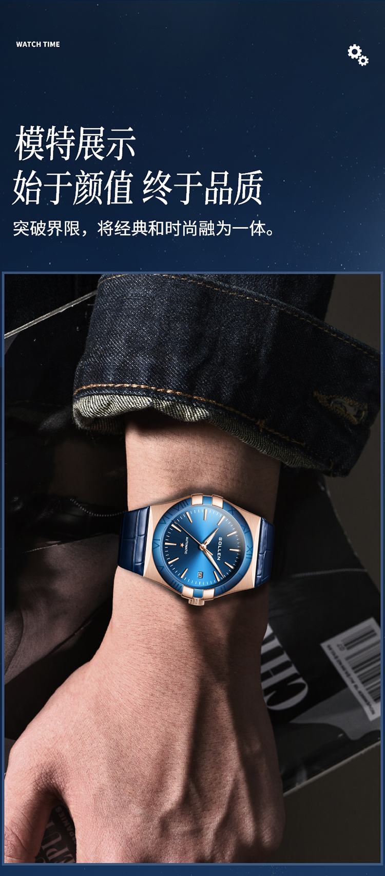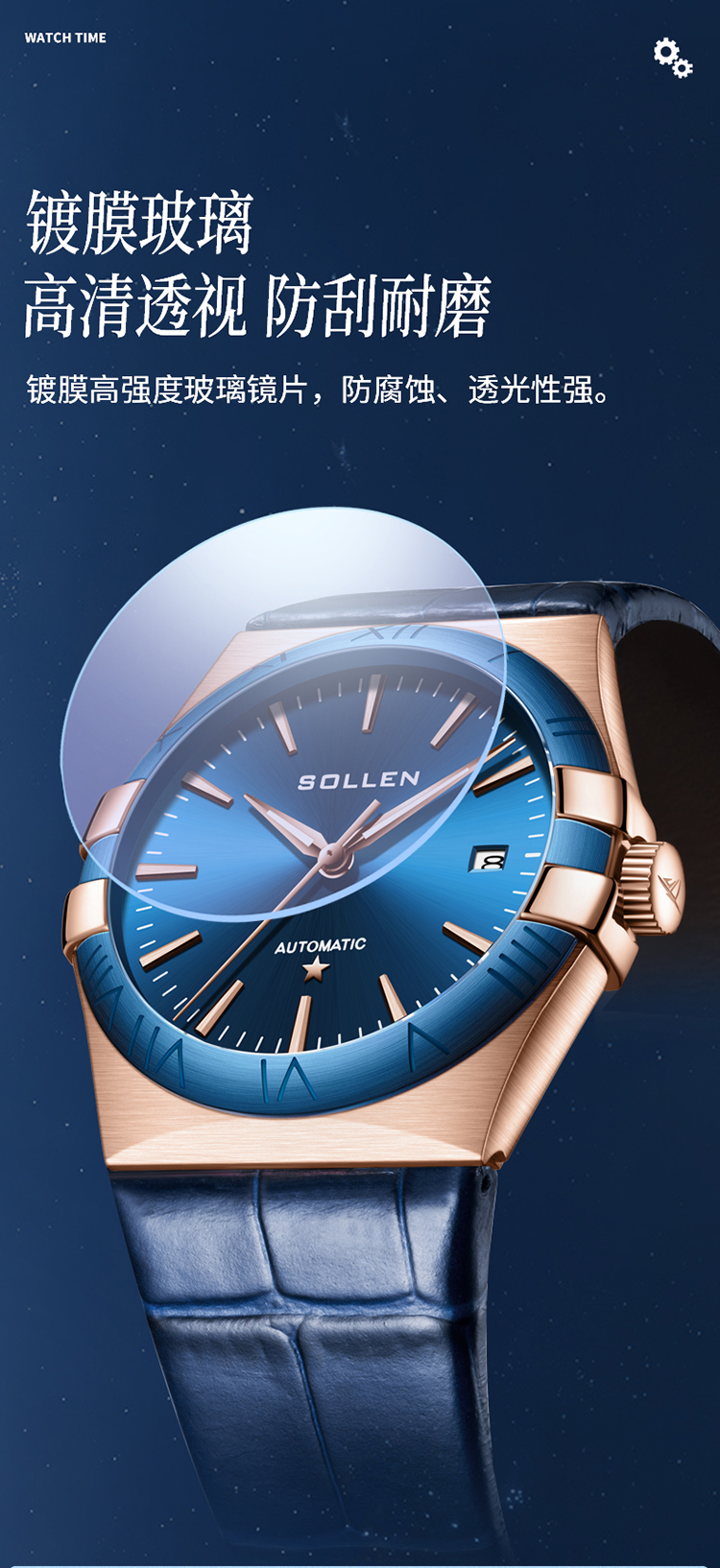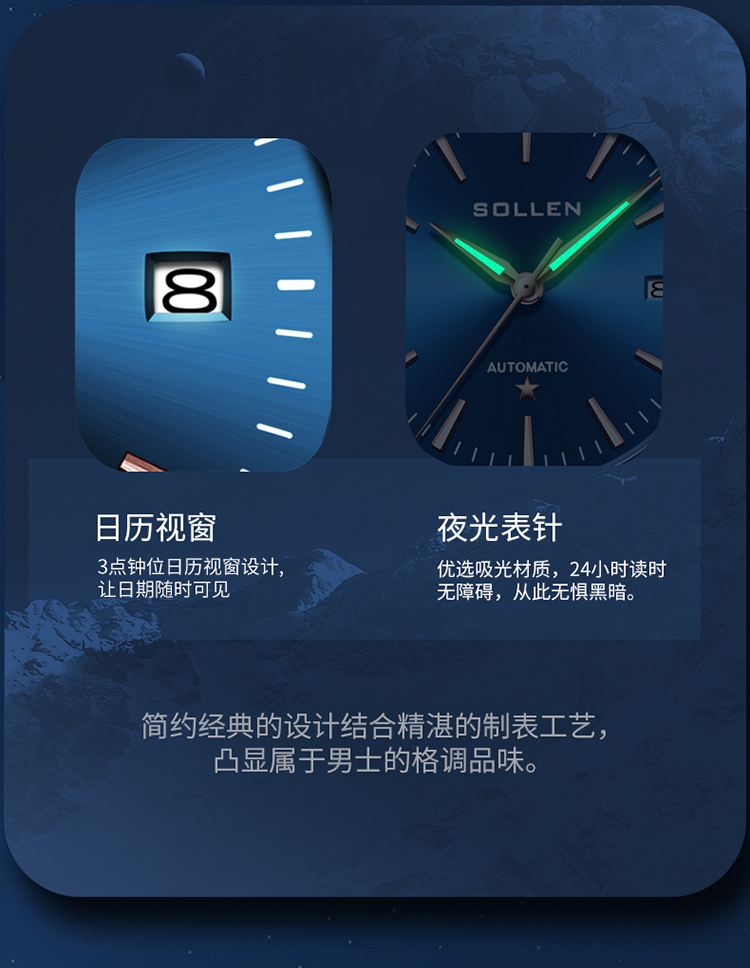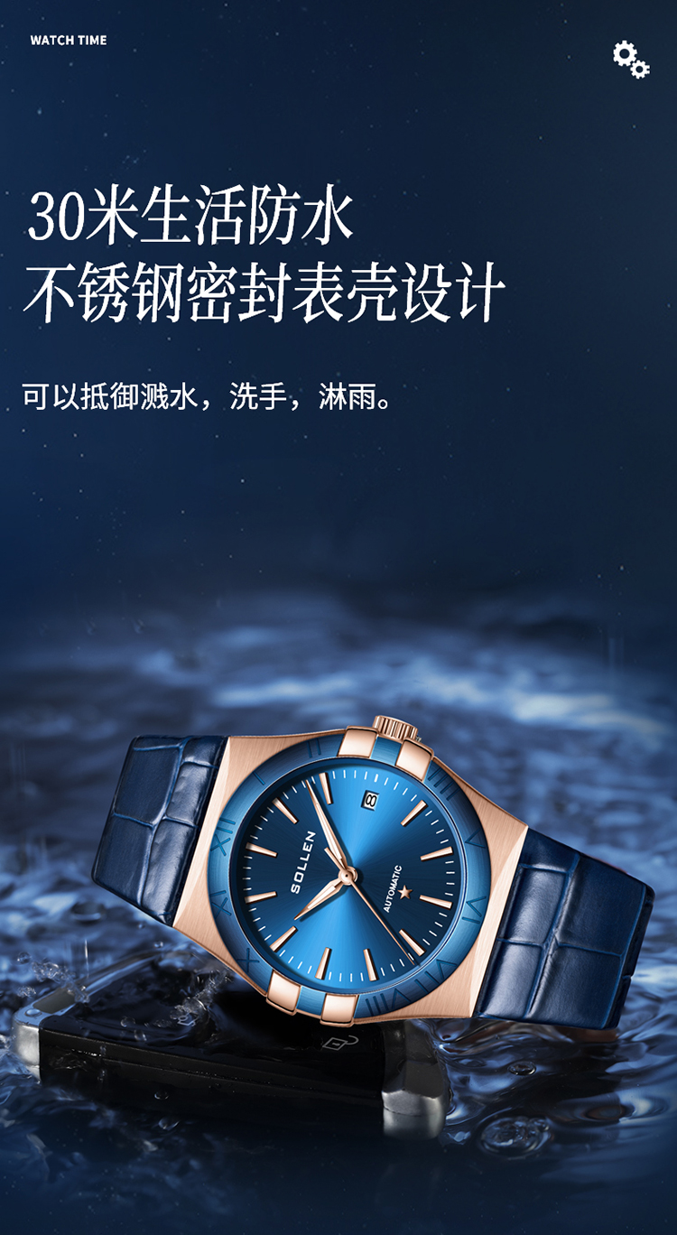 【SL9065】梭伦谜蓝星座系列男士商务蓝盘机械表
