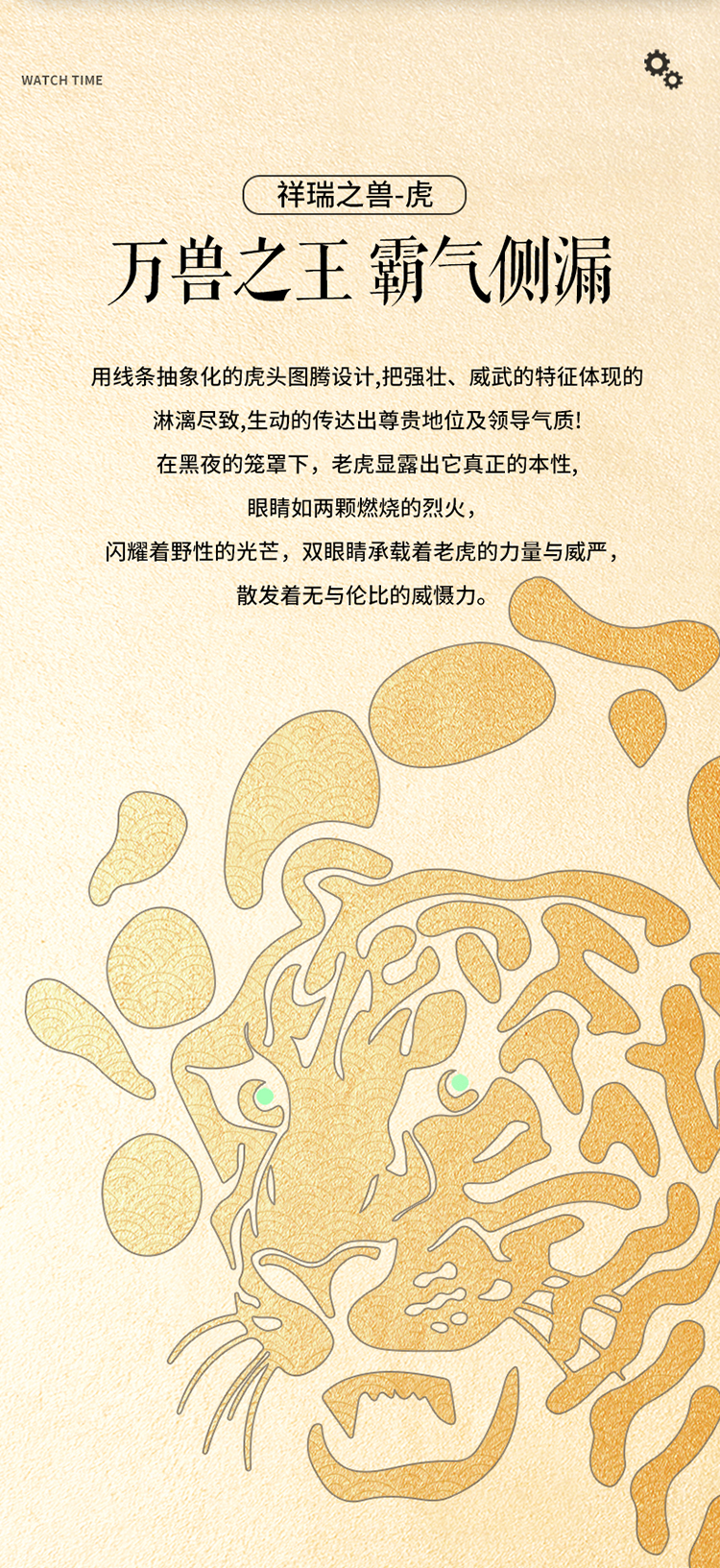 【设计创意】:以虎为设计灵感的限量臻藏手表,设计师巧妙地将野性之美与机械工艺相结合,展现出独特的魅力。表盘上绘制了一只生动的虎,仿佛在诠释着虎的力量与威严。