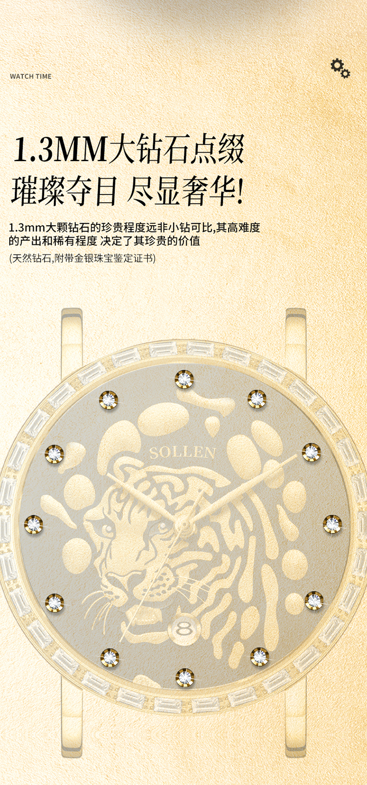 2.盘上的12个整点,均镶嵌了一颗1.3MM的闪耀的大钻石,犹如夜空中璀璨的星辰,与 老虎的双眼交相辉映。