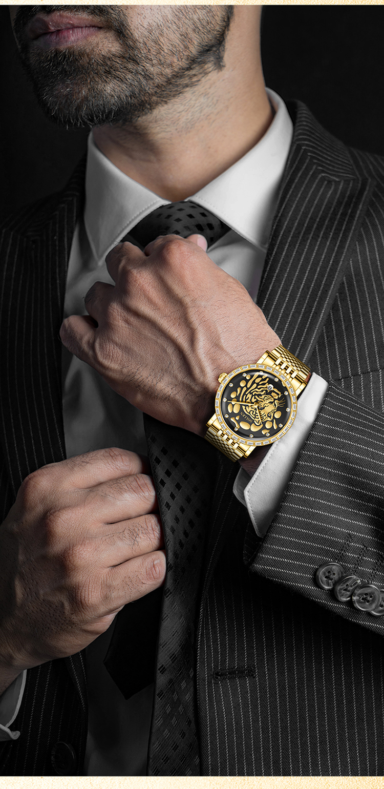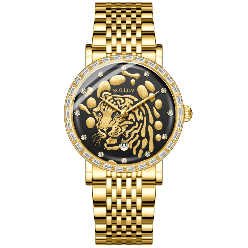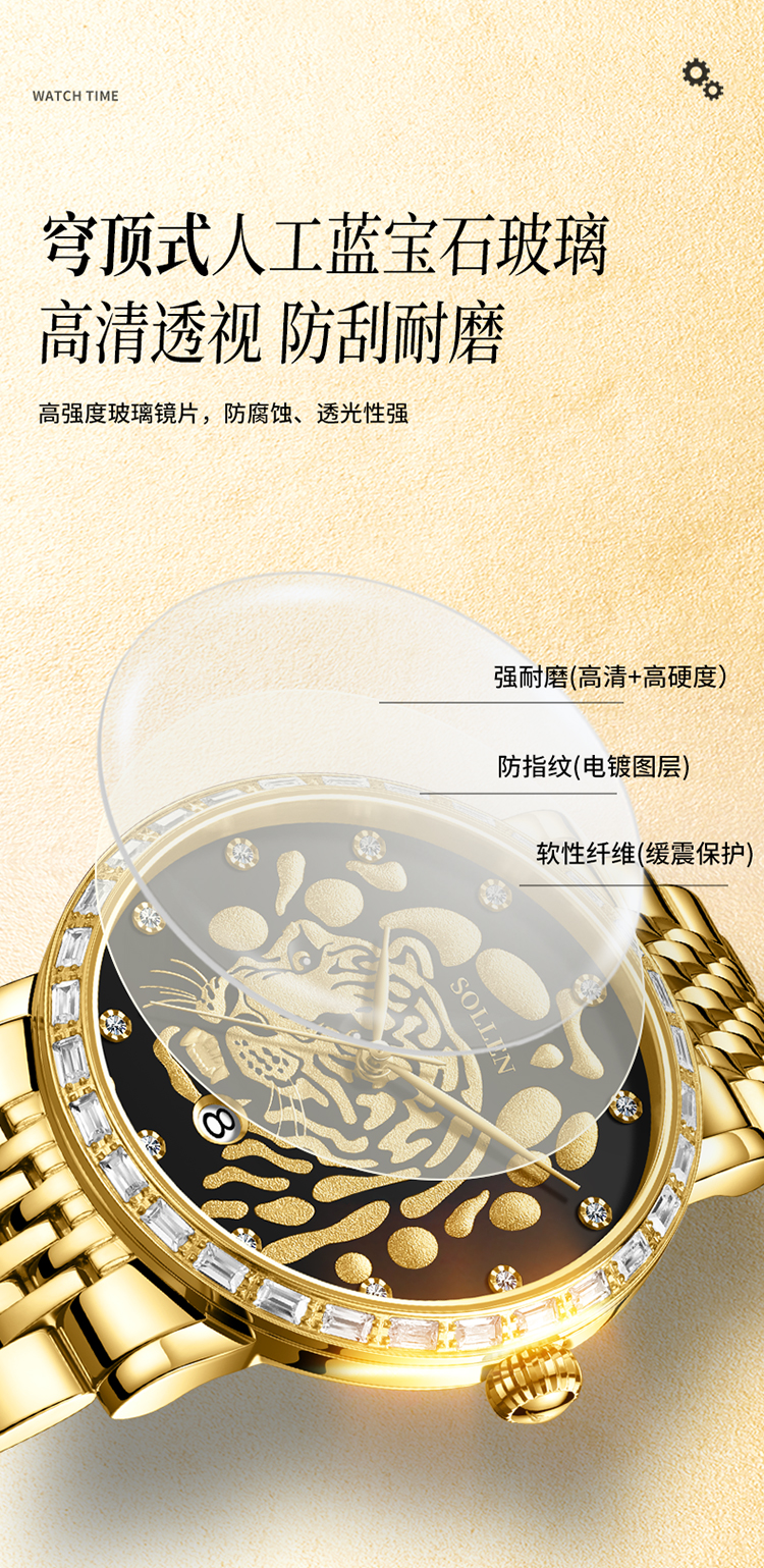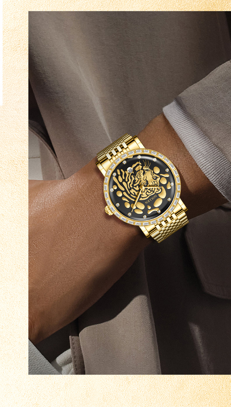 3.搭配表圈外一圈施华锆石,犹如老虎的獠牙,既增添了时尚感,又感受到猛虎的威 慑力。精选不锈钢表壳与表带,如同虎的身躯,坚固耐用,散发出高贵的气息。