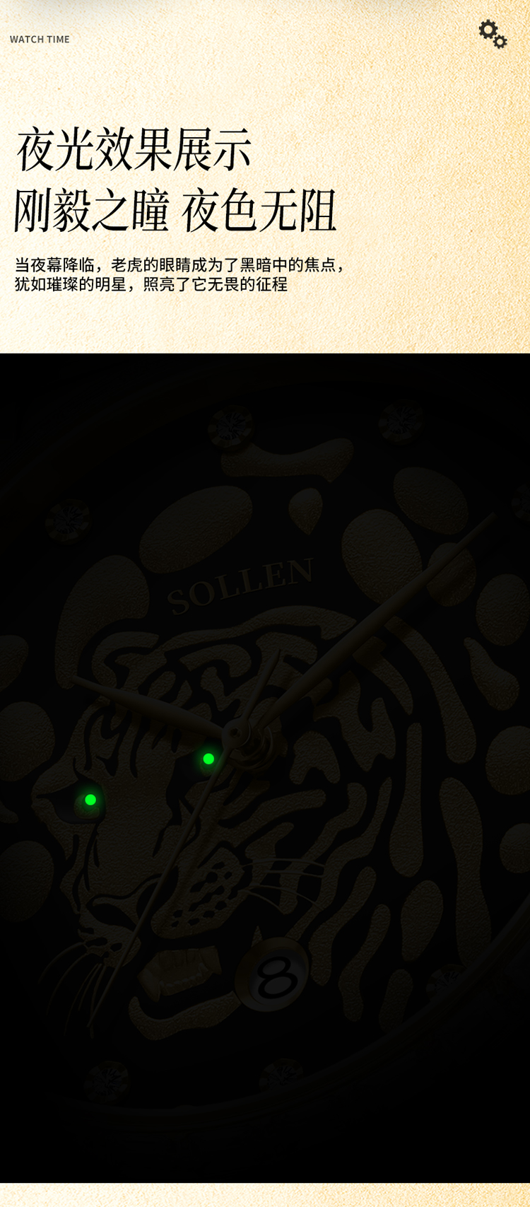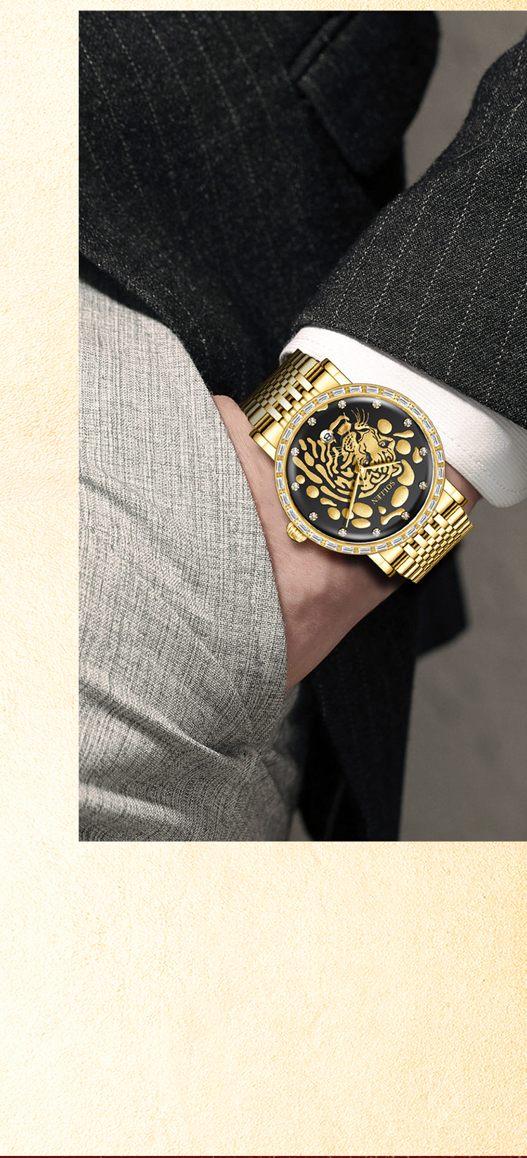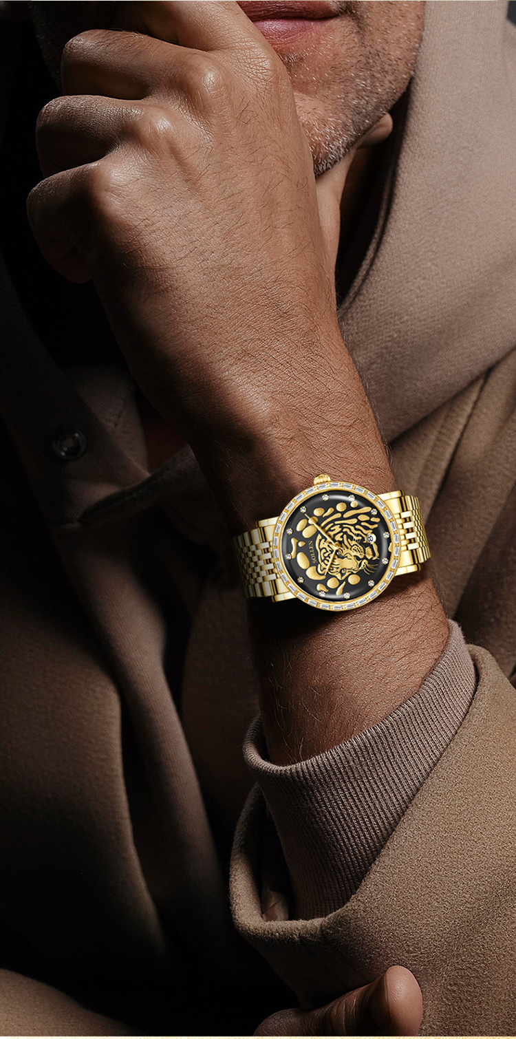 3.搭配表圈外一圈施华锆石,犹如老虎的獠牙,既增添了时尚感,又感受到猛虎的威 慑力。精选不锈钢表壳与表带,如同虎的身躯,坚固耐用,散发出高贵的气息。